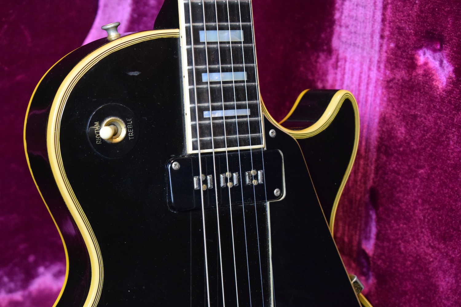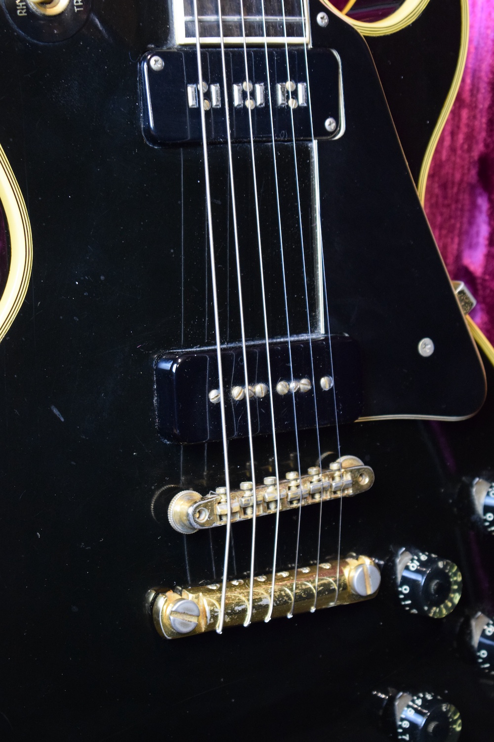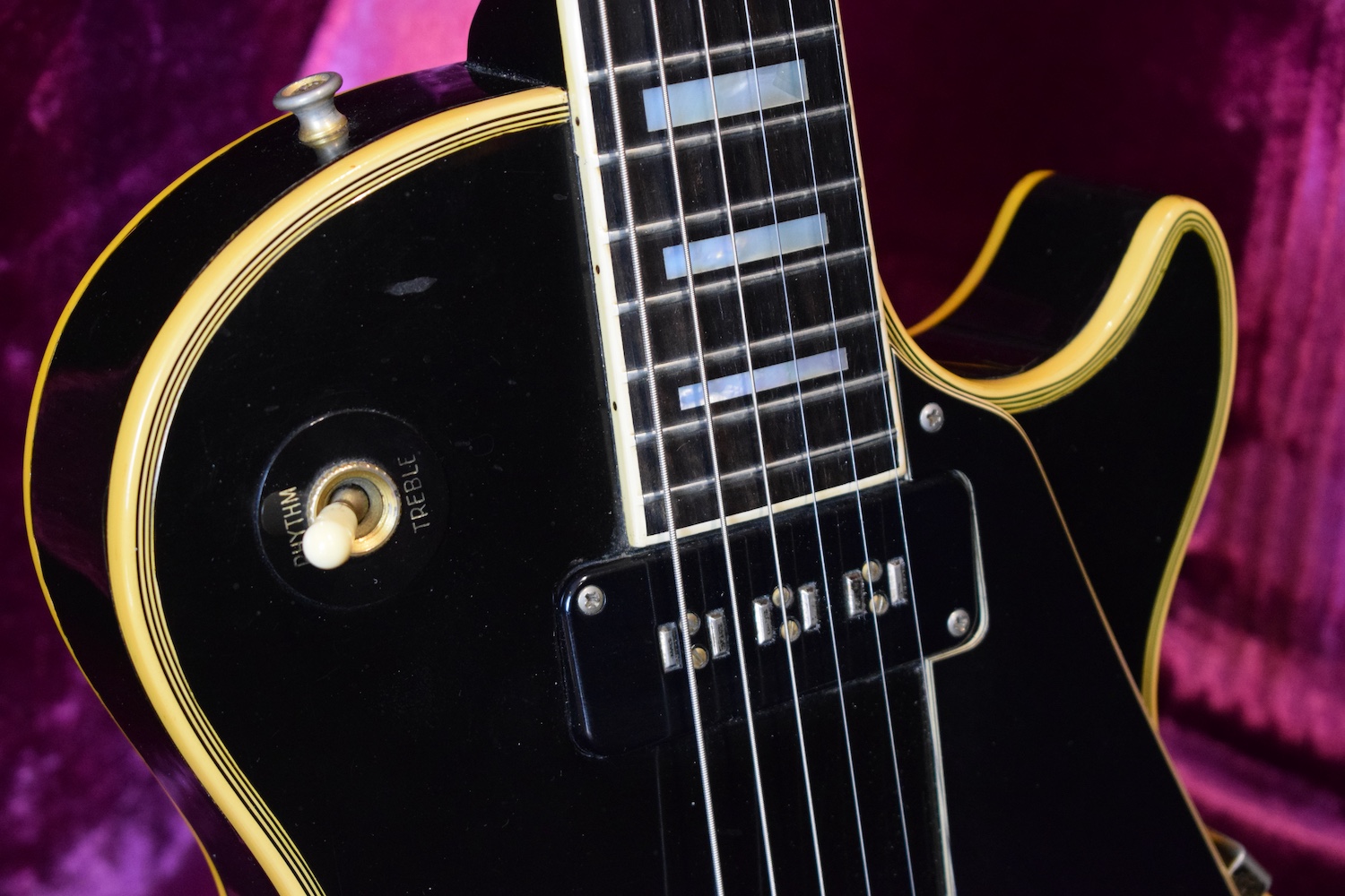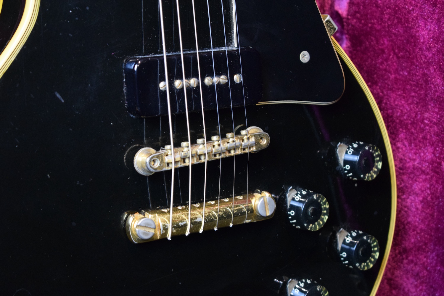Cette magnifique Les Paul est la première recréation du modèle de 1954 avec un micro staple, aussi appelé  Alnico V ou P480, en position manche et un P90 en chevalet.  C’est une configuration originale que l’on ne retrouve qu’au milieu des années 50 de 1954 à 1956.  Ce micro manche était conçu pour offrir une définition high-fidelty,  être moins agressif, moins sujet à la distorsion qu’un P90. Il fut naturellement ensuite retiré de la gamme quand le humbucker fit son apparition. Cette version de la Les Paul custom ne fut ensuite que brièvement reproduite en 1972 et 1973. C’est un instrument fidèle à l’original, on constatera juste que le manche porte dorénavant une volute mais pour le reste la construction est très proche avec un corps non pancake, et un manche une pièce en acajou. Les essences sont particulièrement bien choisies car la guitare ne pèse que 4kg, ce qui se ressent évidemment dans le son et dans le plaisir à jouer. Déjà on ne la porte pas comme une croix, et une Les Paul qui ne pèse que 4kg ça vibre,  et celle ci est vraiment très jouable et résonante. Elle est en excellent état de conservation, avec toutes ses pièces d’origine, et sans réparations. Le vernis original est en très bon état, quelques rayures car elle a joué mais rien de bien méchant.