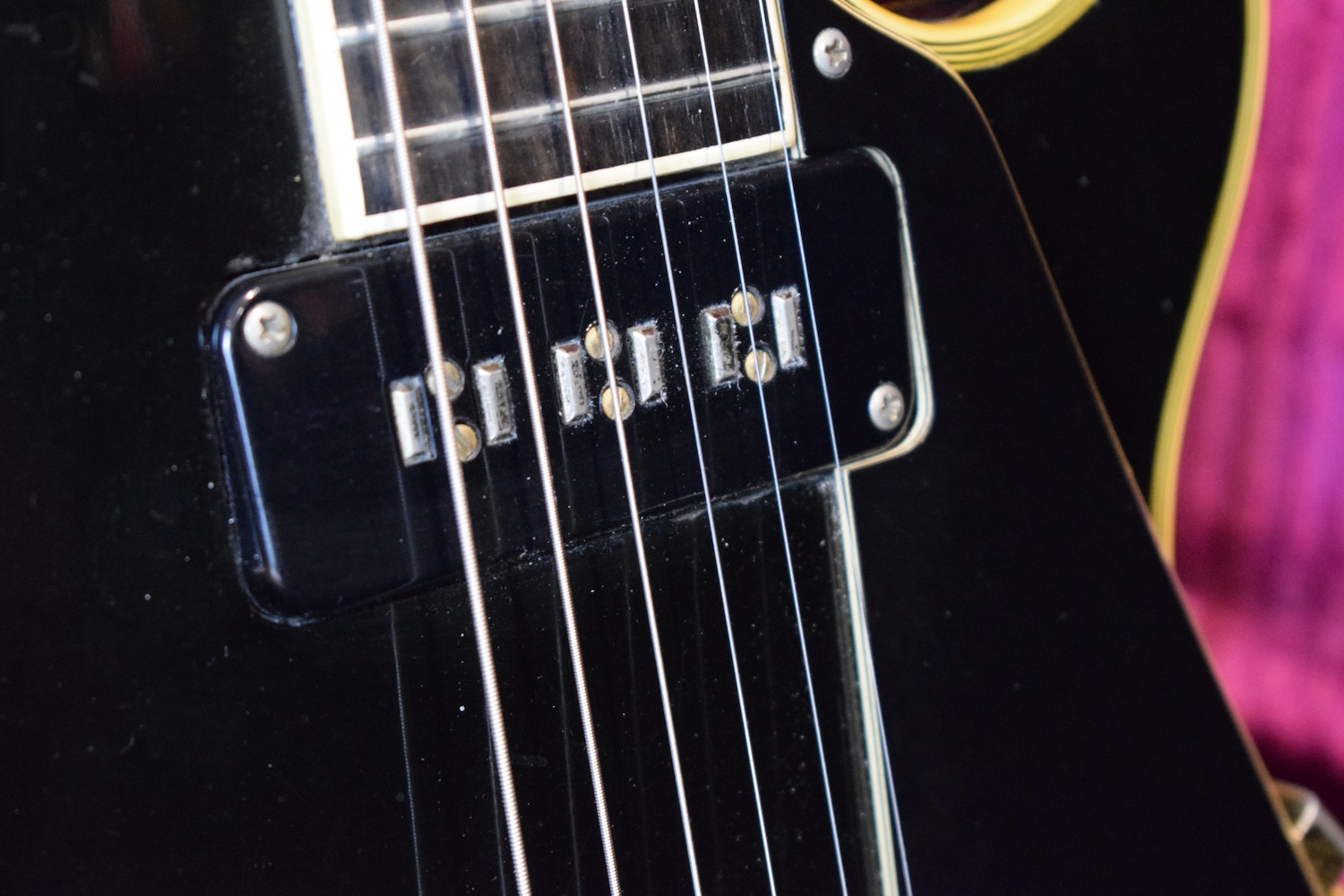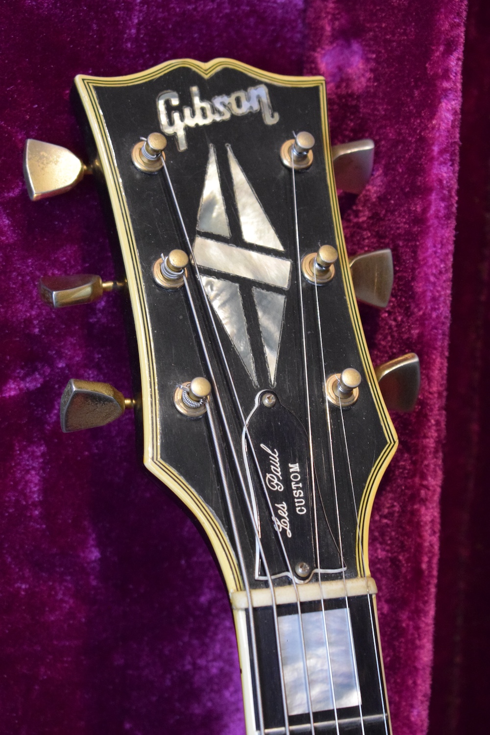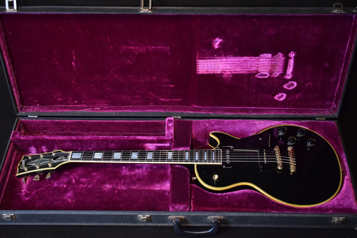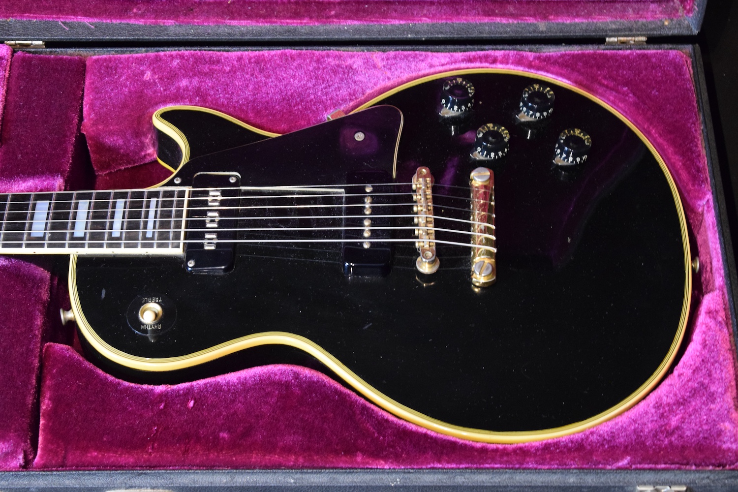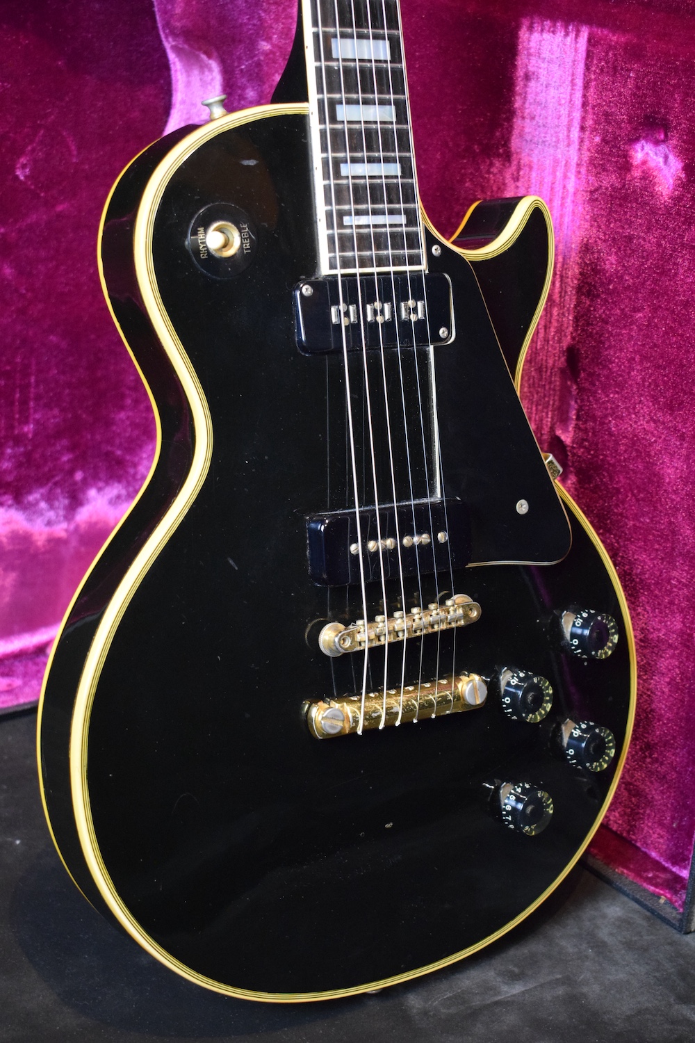Cette magnifique Les Paul est la première recréation du modèle de 1954 avec un micro staple, aussi appelé  Alnico V ou P480, en position manche et un P90 en chevalet.  C’est une configuration originale que l’on ne retrouve qu’au milieu des années 50 de 1954 à 1956.  Ce micro manche était conçu pour offrir une définition high-fidelty,  être moins agressif, moins sujet à la distorsion qu’un P90. Il fut naturellement ensuite retiré de la gamme quand le humbucker fit son apparition. Cette version de la Les Paul custom ne fut ensuite que brièvement reproduite en 1972 et 1973. C’est un instrument fidèle à l’original, on constatera juste que le manche porte dorénavant une volute mais pour le reste la construction est très proche avec un corps non pancake, et un manche une pièce en acajou. Les essences sont particulièrement bien choisies car la guitare ne pèse que 4kg, ce qui se ressent évidemment dans le son et dans le plaisir à jouer. Déjà on ne la porte pas comme une croix, et une Les Paul qui ne pèse que 4kg ça vibre,  et celle ci est vraiment très jouable et résonante. Elle est en excellent état de conservation, avec toutes ses pièces d’origine, et sans réparations. Le vernis original est en très bon état, quelques rayures car elle a joué mais rien de bien méchant.