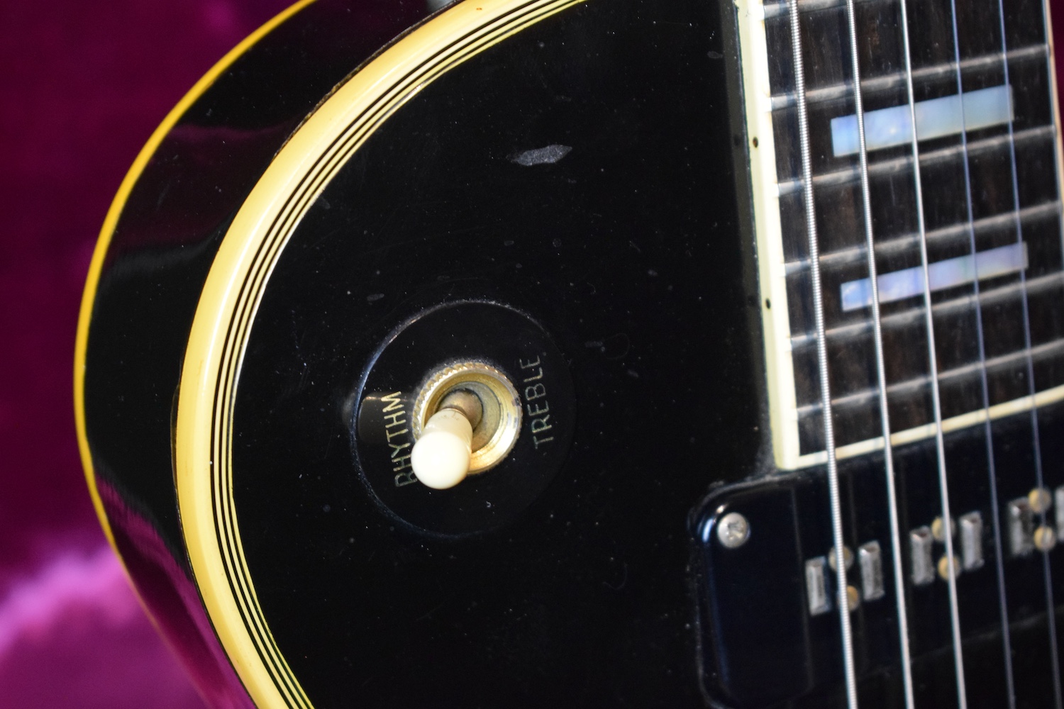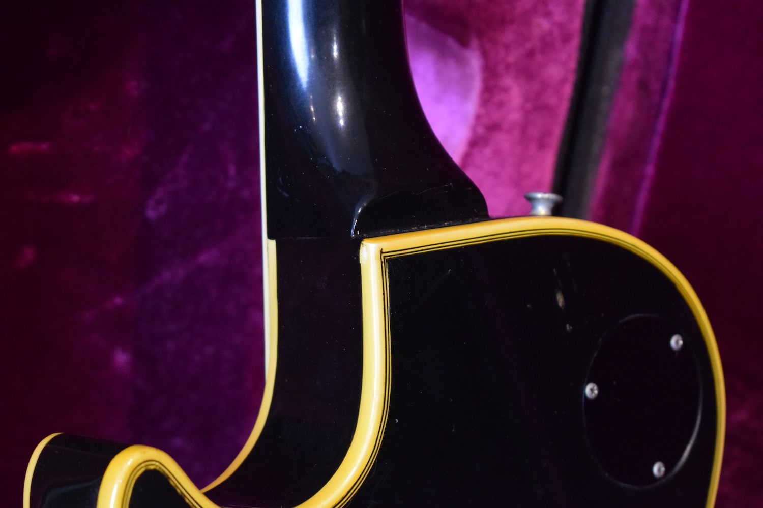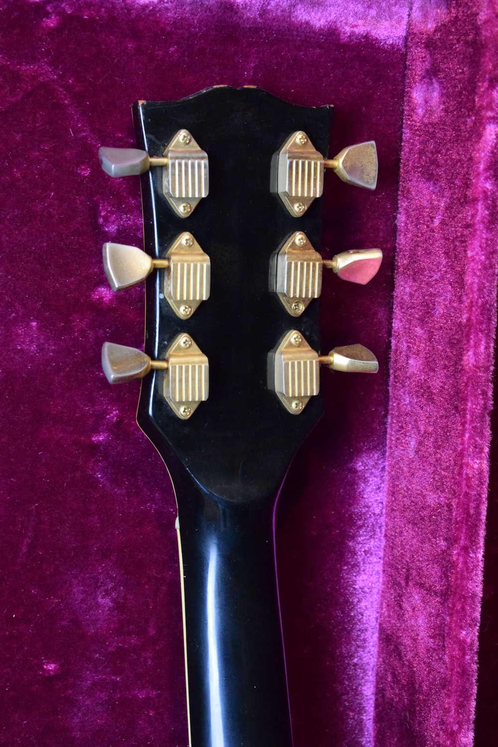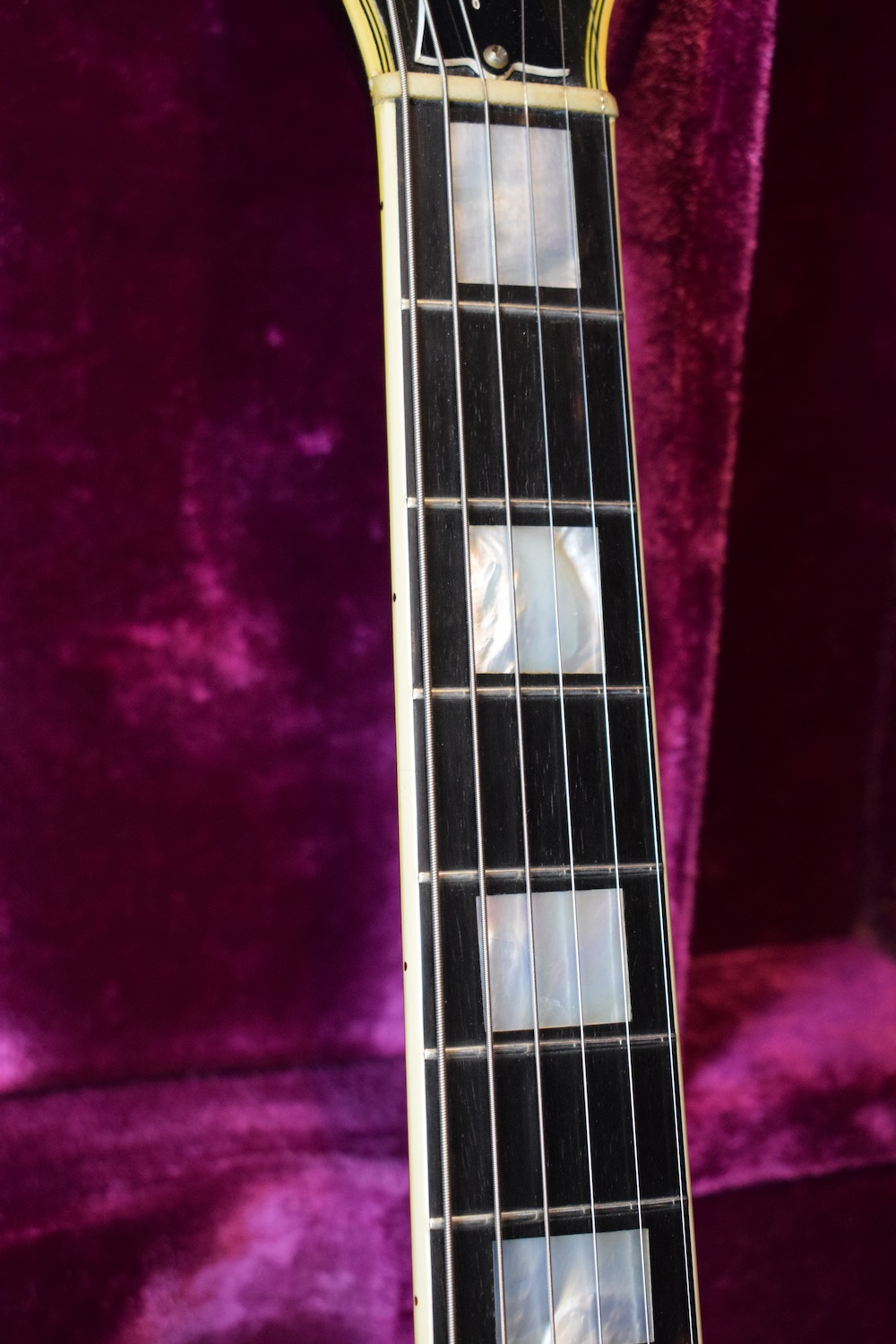 Cette magnifique Les Paul est la première recréation du modèle de 1954 avec un micro staple, aussi appelé  Alnico V ou P480, en position manche et un P90 en chevalet.  C’est une configuration originale que l’on ne retrouve qu’au milieu des années 50 de 1954 à 1956.  Ce micro manche était conçu pour offrir une définition high-fidelty,  être moins agressif, moins sujet à la distorsion qu’un P90. Il fut naturellement ensuite retiré de la gamme quand le humbucker fit son apparition. Cette version de la Les Paul custom ne fut ensuite que brièvement reproduite en 1972 et 1973. C’est un instrument fidèle à l’original, on constatera juste que le manche porte dorénavant une volute mais pour le reste la construction est très proche avec un corps non pancake, et un manche une pièce en acajou. Les essences sont particulièrement bien choisies car la guitare ne pèse que 4kg, ce qui se ressent évidemment dans le son et dans le plaisir à jouer. Déjà on ne la porte pas comme une croix, et une Les Paul qui ne pèse que 4kg ça vibre,  et celle ci est vraiment très jouable et résonante. Elle est en excellent état de conservation, avec toutes ses pièces d’origine, et sans réparations. Le vernis original est en très bon état, quelques rayures car elle a joué mais rien de bien méchant.