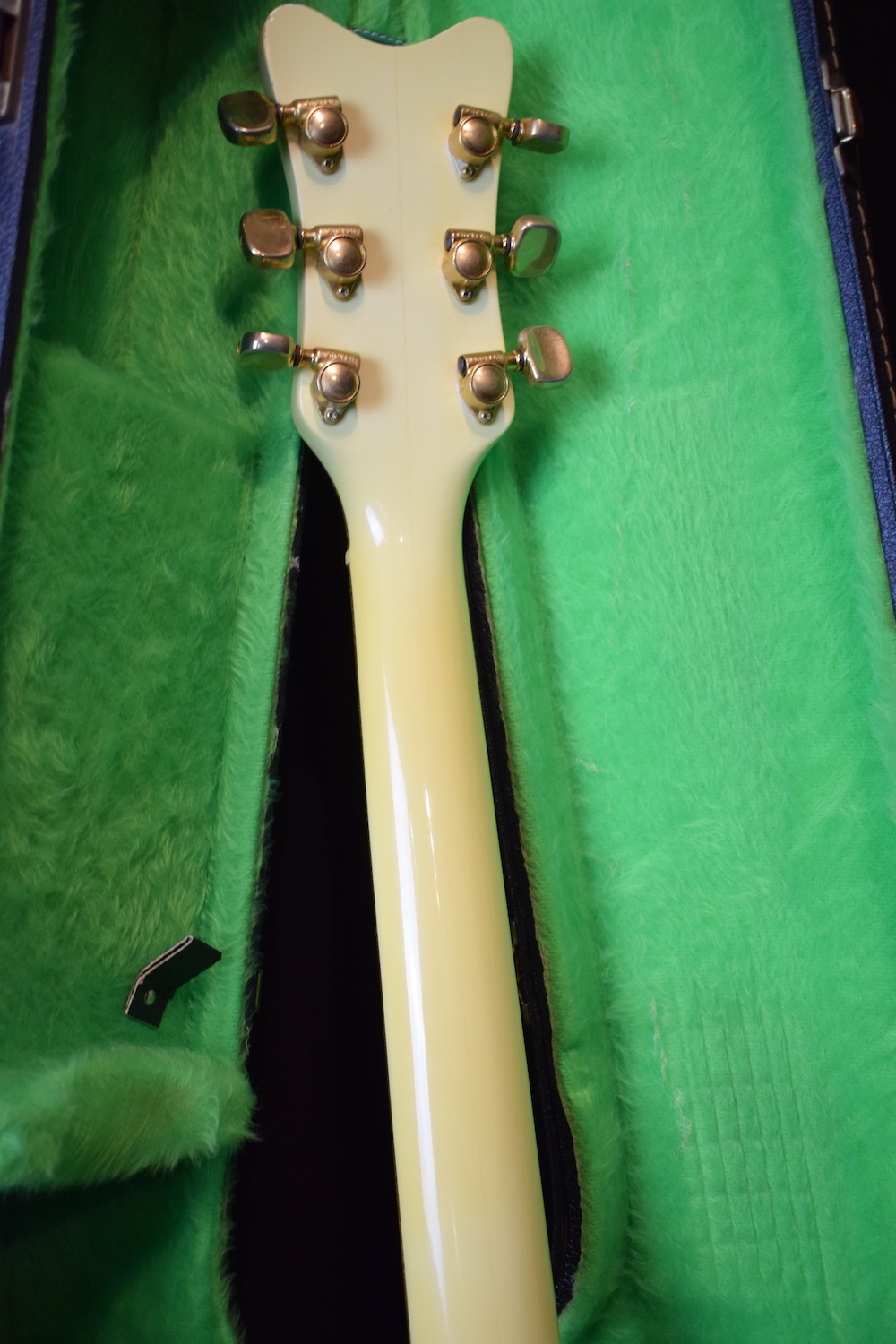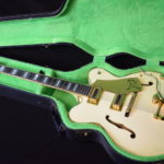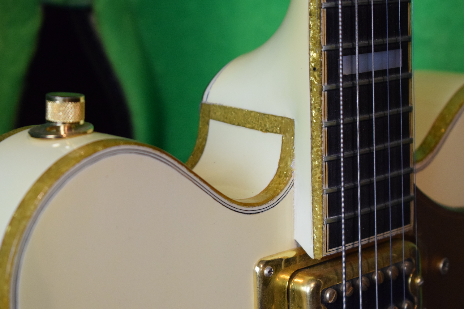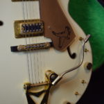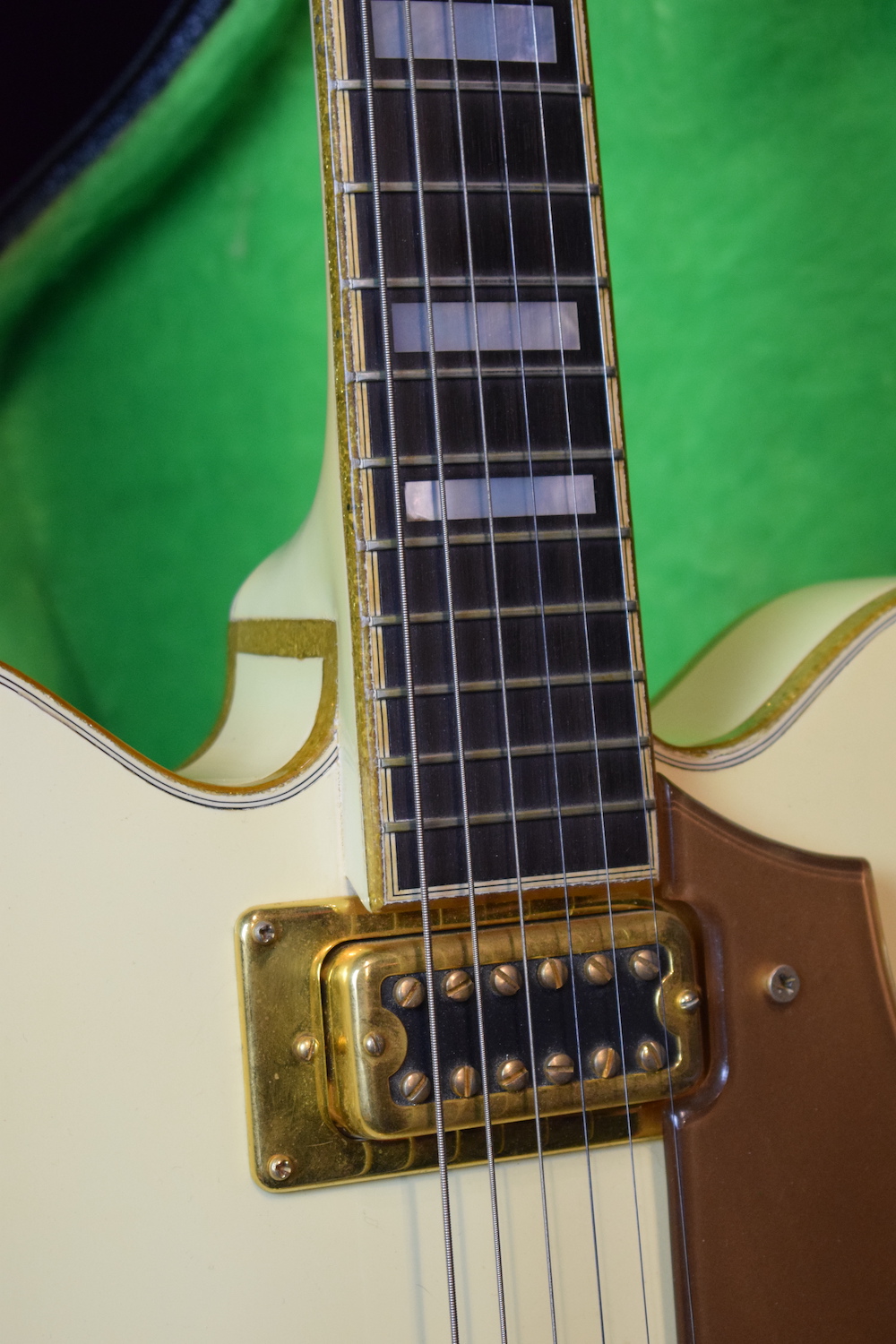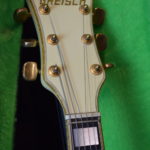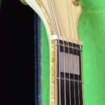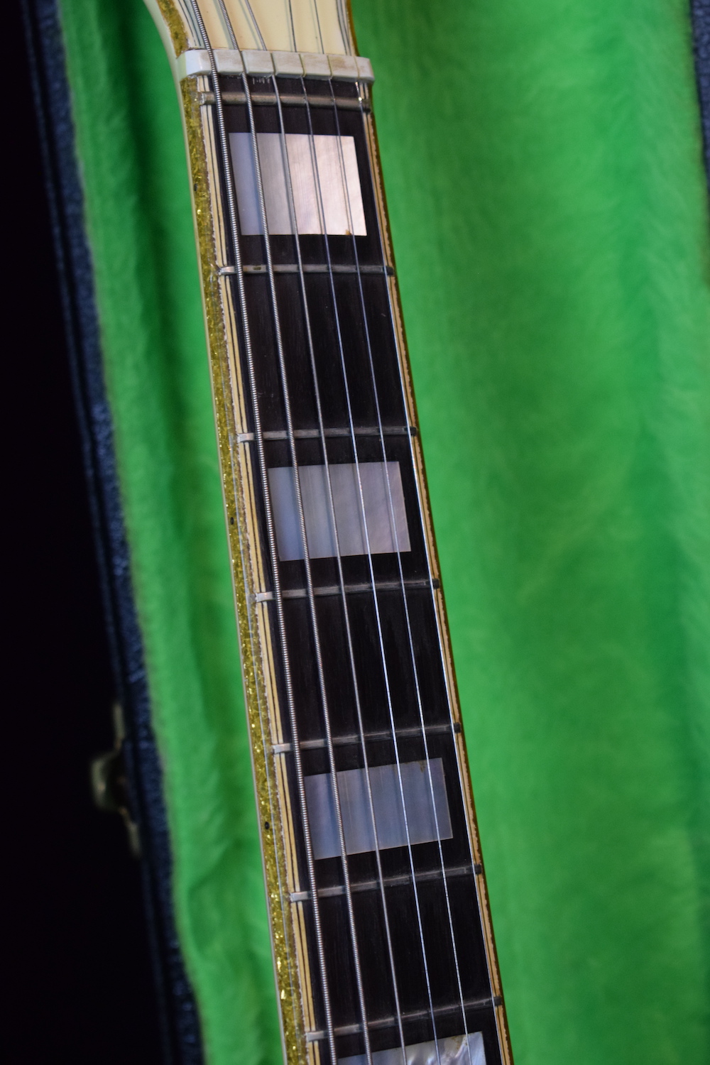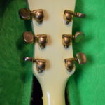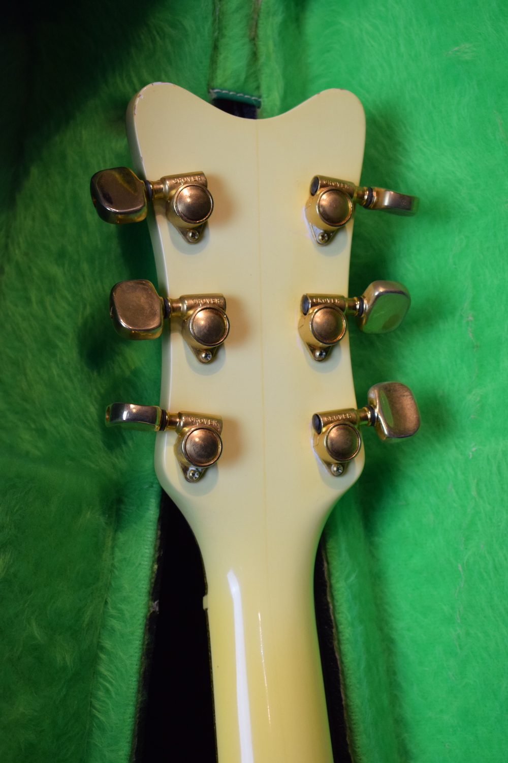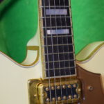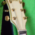 La White Falcon était conçue pour émerveiller et force est de constater que des décennies après quand on ouvre un de ses étuis, la magie opère toujours. C’est ici dans une ses versions les plus simples que nous la retrouvons. Elle a en effet connu de nombreuses modifications aec plus ou moins de fioritures et la version de la fin des années 70 est probablement une des plus épurées. Comme vous le voyez l’instrument est en parfait état, y compris son binding. Je me suis évertué avec plaisir à la photographier sous toutes les coutures. Elle est facile à jouer et récemment réglée. Elle n’a subi aucune réparation ou modifications. L’instrument iconique de la marque, dans un état irréprochable. Pour ne rien gâcher elle est vendue avec son étui rigide original.
