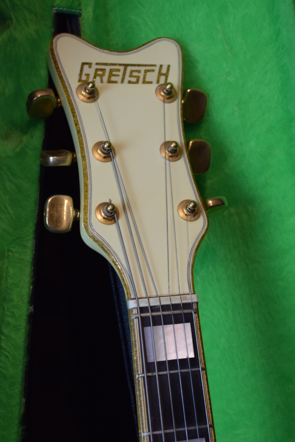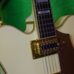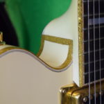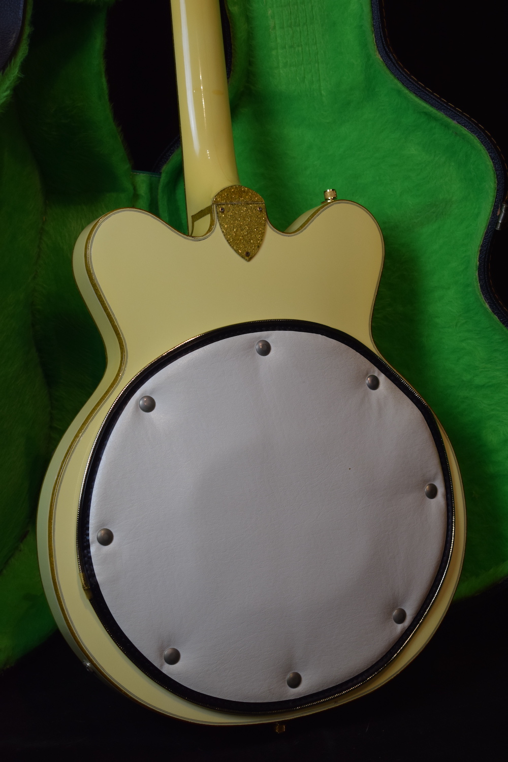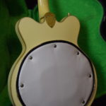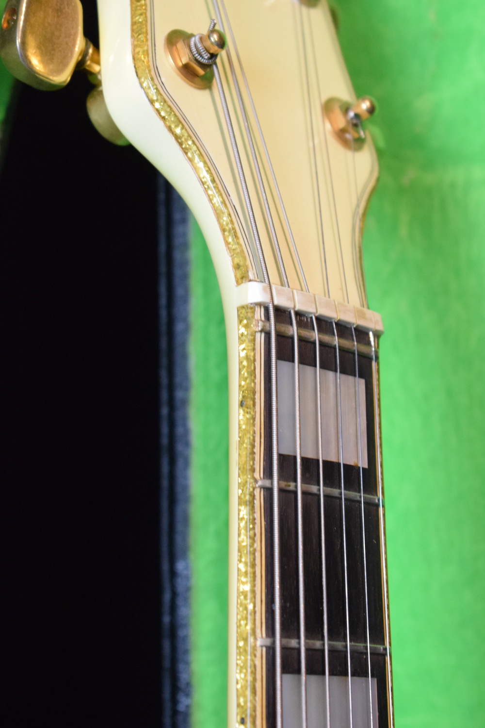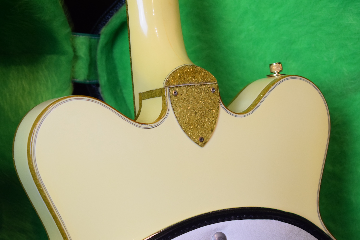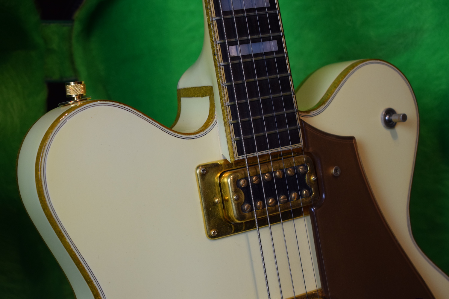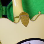 La White Falcon était conçue pour émerveiller et force est de constater que des décennies après quand on ouvre un de ses étuis, la magie opère toujours. C’est ici dans une ses versions les plus simples que nous la retrouvons. Elle a en effet connu de nombreuses modifications aec plus ou moins de fioritures et la version de la fin des années 70 est probablement une des plus épurées. Comme vous le voyez l’instrument est en parfait état, y compris son binding. Je me suis évertué avec plaisir à la photographier sous toutes les coutures. Elle est facile à jouer et récemment réglée. Elle n’a subi aucune réparation ou modifications. L’instrument iconique de la marque, dans un état irréprochable. Pour ne rien gâcher elle est vendue avec son étui rigide original.