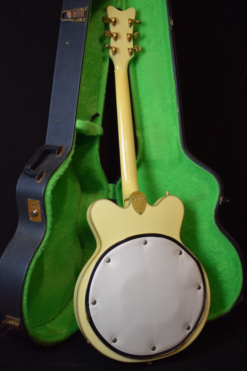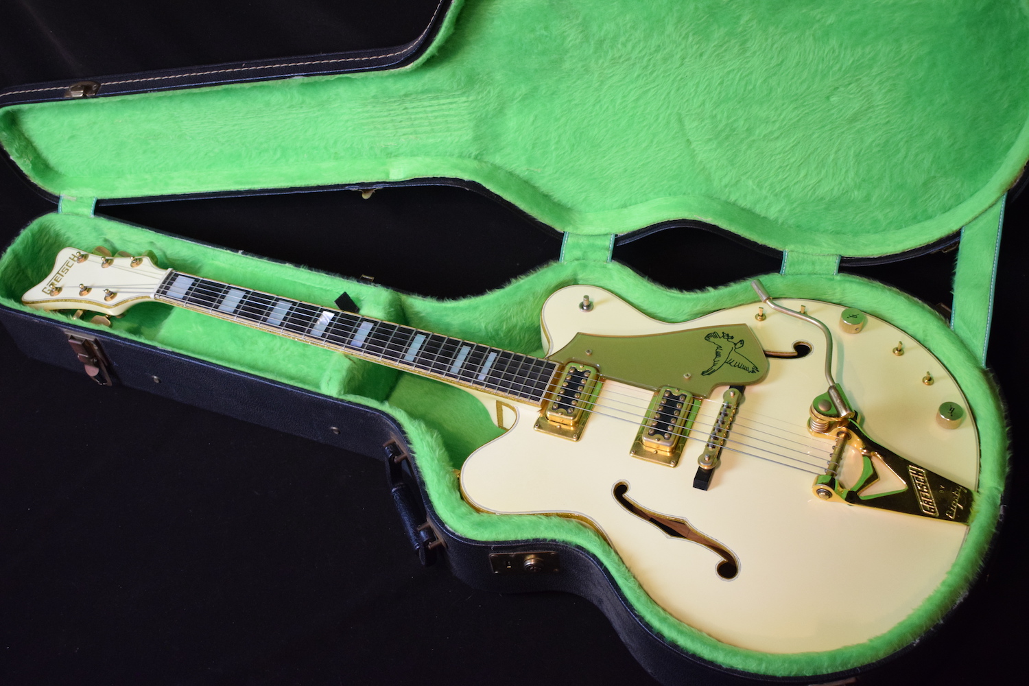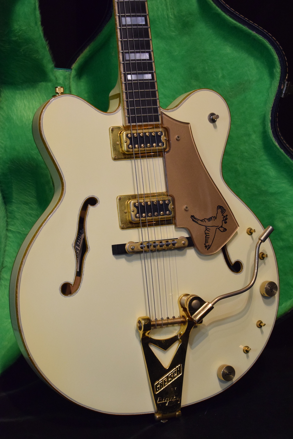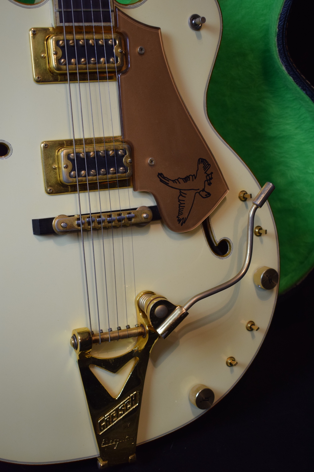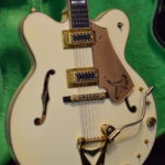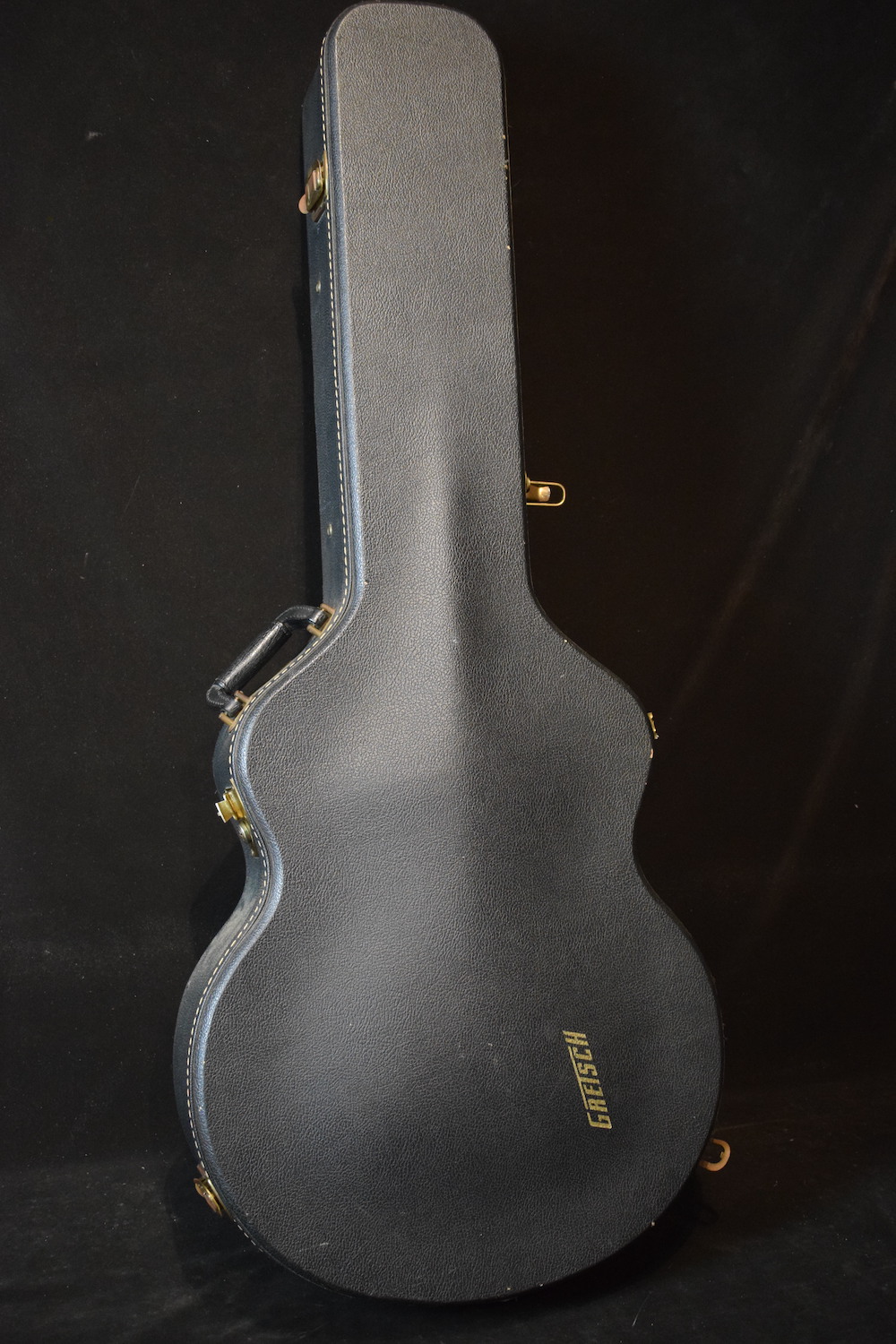 La White Falcon était conçue pour émerveiller et force est de constater que des décennies après quand on ouvre un de ses étuis, la magie opère toujours. C’est ici dans une ses versions les plus simples que nous la retrouvons. Elle a en effet connu de nombreuses modifications aec plus ou moins de fioritures et la version de la fin des années 70 est probablement une des plus épurées. Comme vous le voyez l’instrument est en parfait état, y compris son binding. Je me suis évertué avec plaisir à la photographier sous toutes les coutures. Elle est facile à jouer et récemment réglée. Elle n’a subi aucune réparation ou modifications. L’instrument iconique de la marque, dans un état irréprochable. Pour ne rien gâcher elle est vendue avec son étui rigide original.