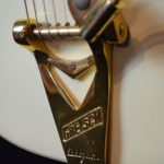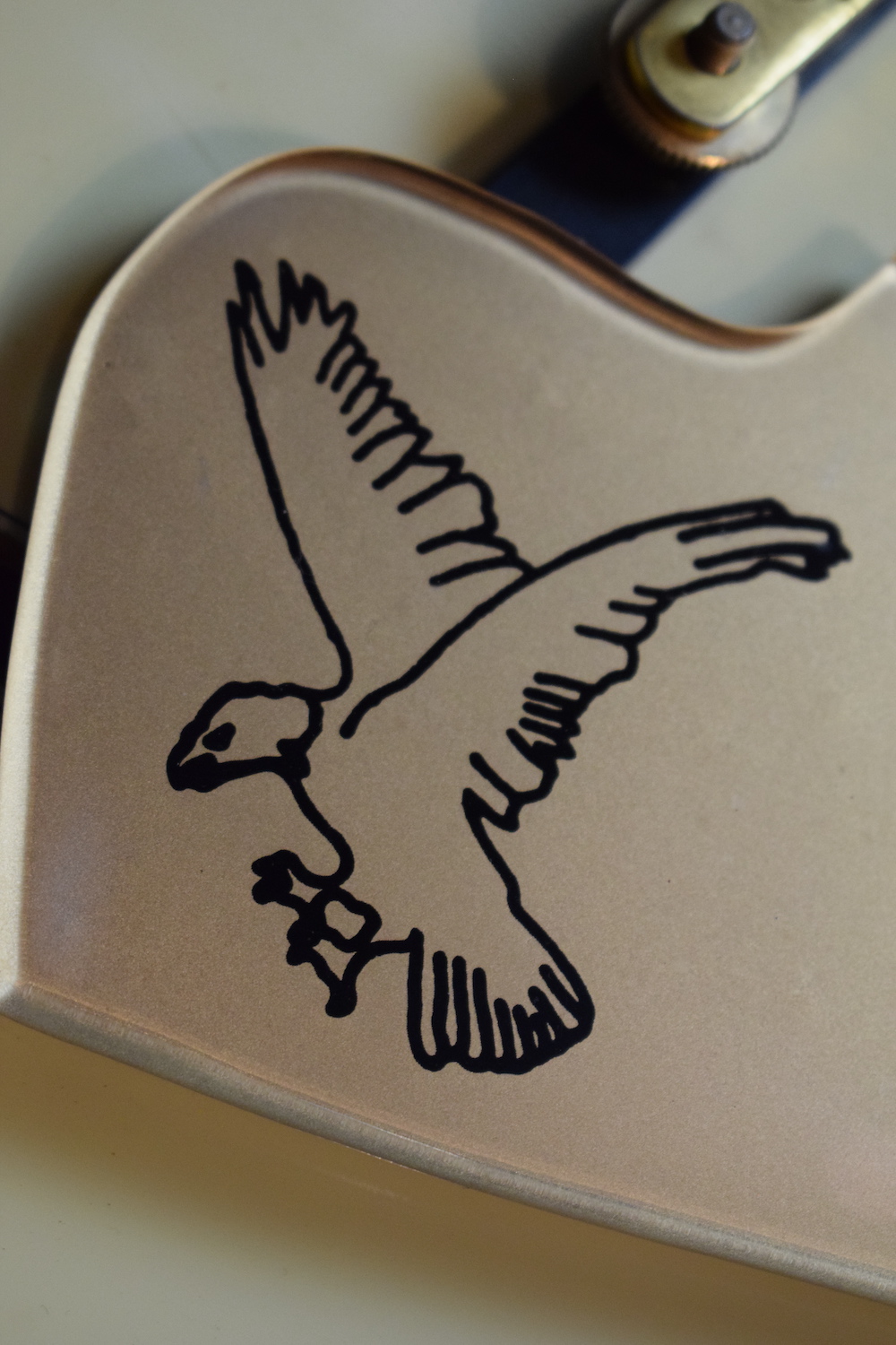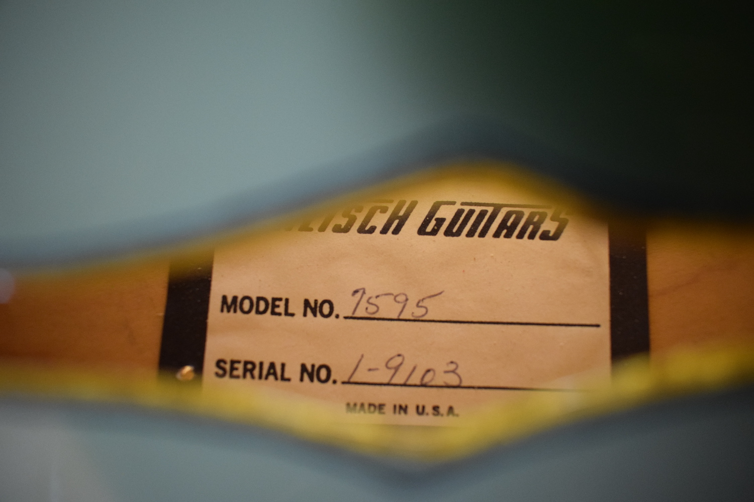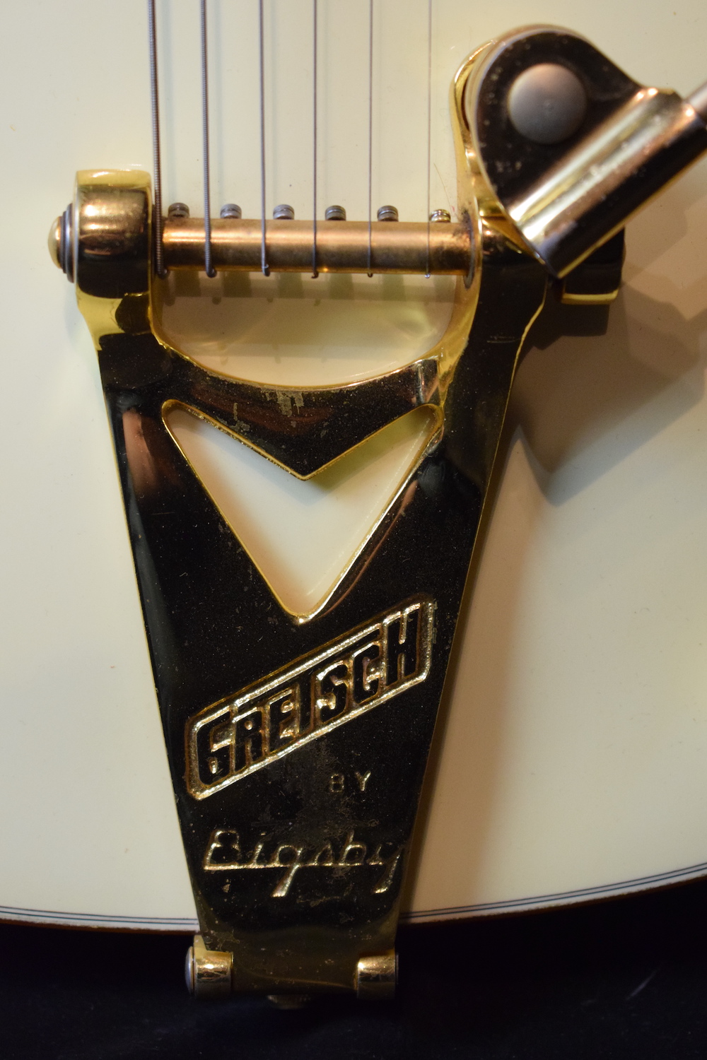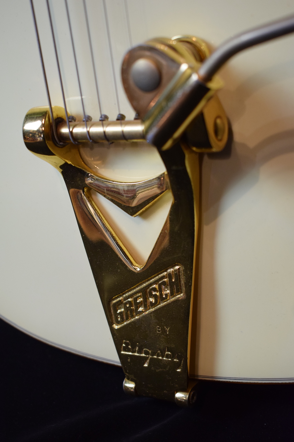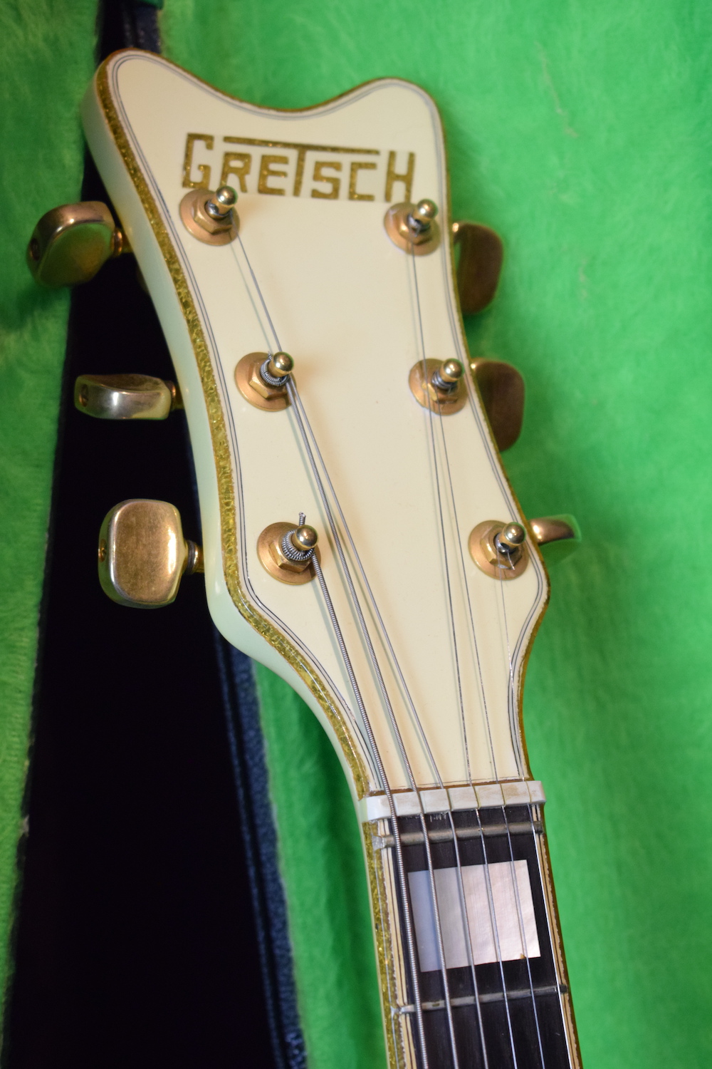 La White Falcon était conçue pour émerveiller et force est de constater que des décennies après quand on ouvre un de ses étuis, la magie opère toujours. C’est ici dans une ses versions les plus simples que nous la retrouvons. Elle a en effet connu de nombreuses modifications aec plus ou moins de fioritures et la version de la fin des années 70 est probablement une des plus épurées. Comme vous le voyez l’instrument est en parfait état, y compris son binding. Je me suis évertué avec plaisir à la photographier sous toutes les coutures. Elle est facile à jouer et récemment réglée. Elle n’a subi aucune réparation ou modifications. L’instrument iconique de la marque, dans un état irréprochable. Pour ne rien gâcher elle est vendue avec son étui rigide original.