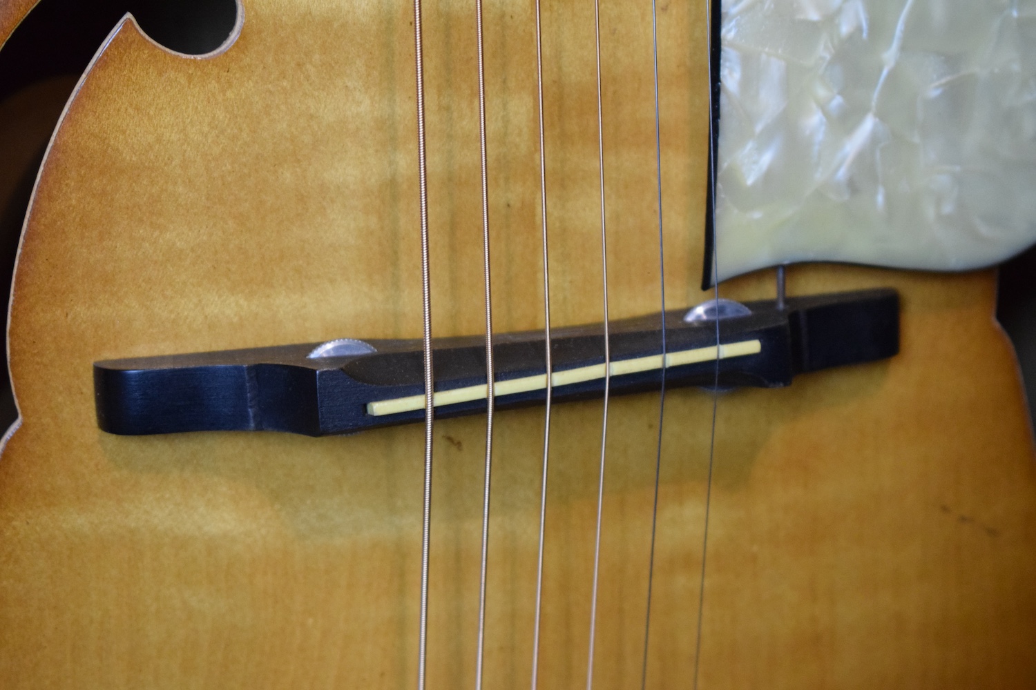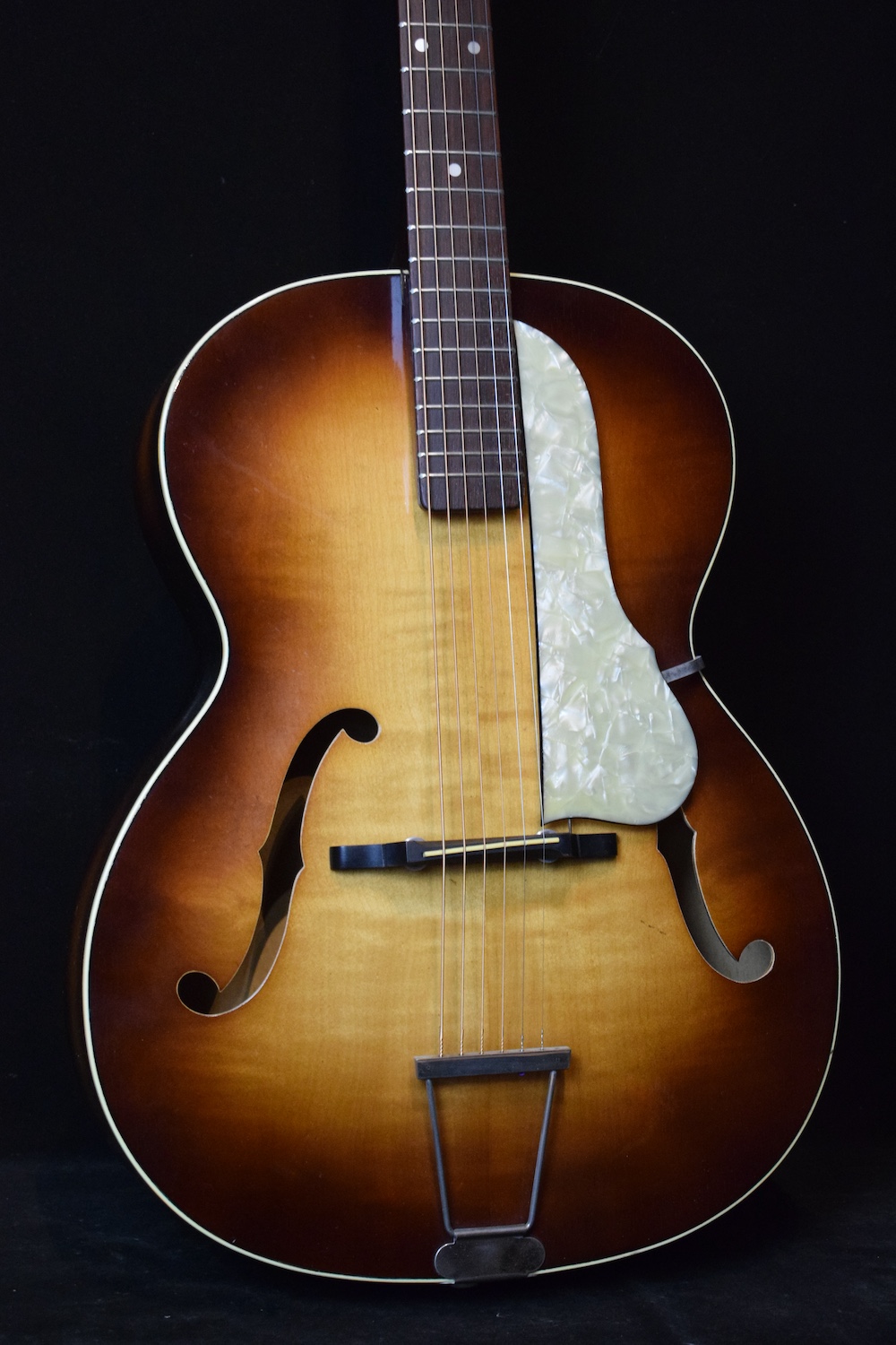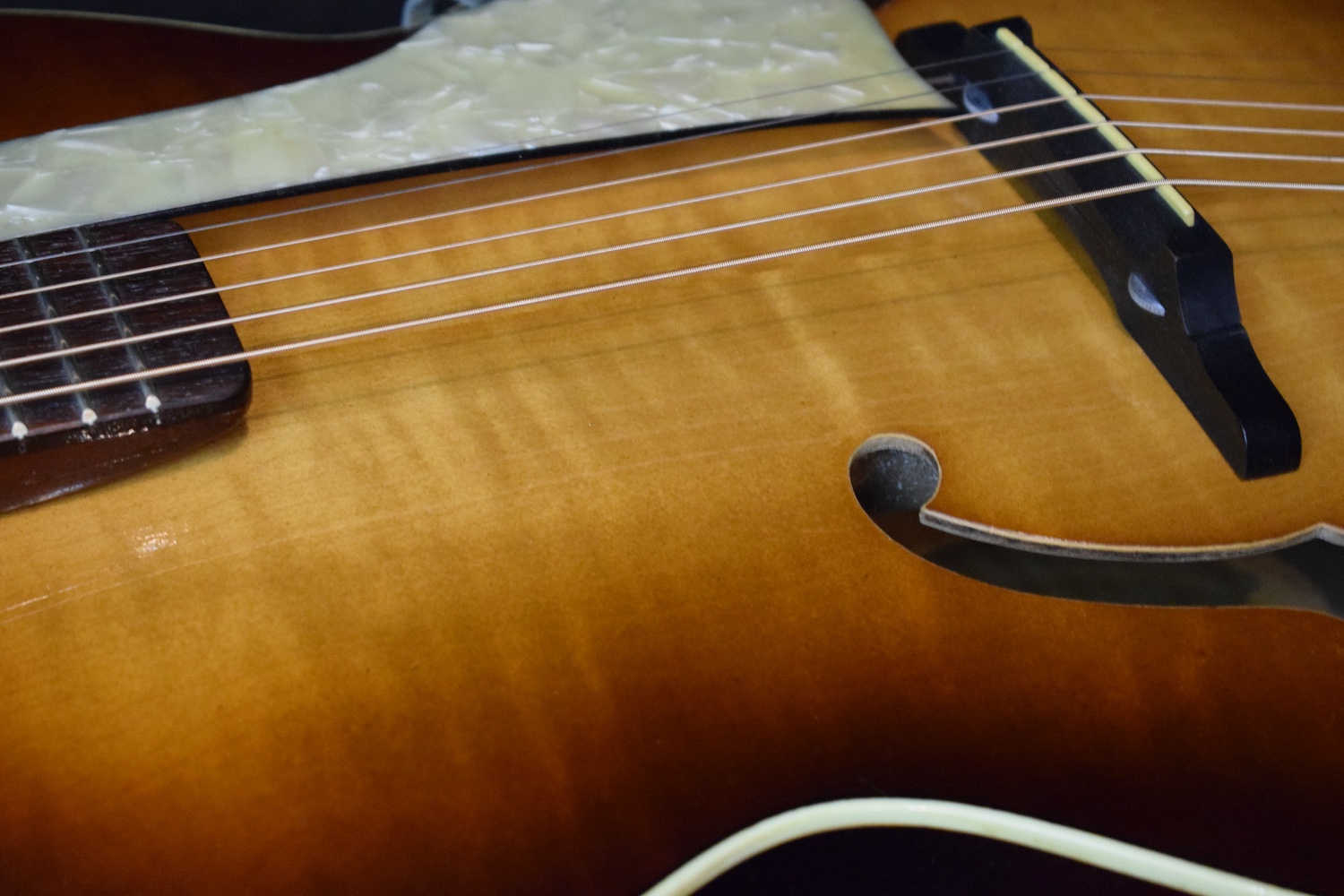 Déjà par les essences, regardez le dos, mais aussi par le son et la jouabilité. Elle possède un très joli timbre jazz et joue franchement très bien avec une action basse et un angle idéal. Je ne suis pas en train de vous dire que c’est aussi bien qu’une L5 mais pour le prix c’est vraiment bien.