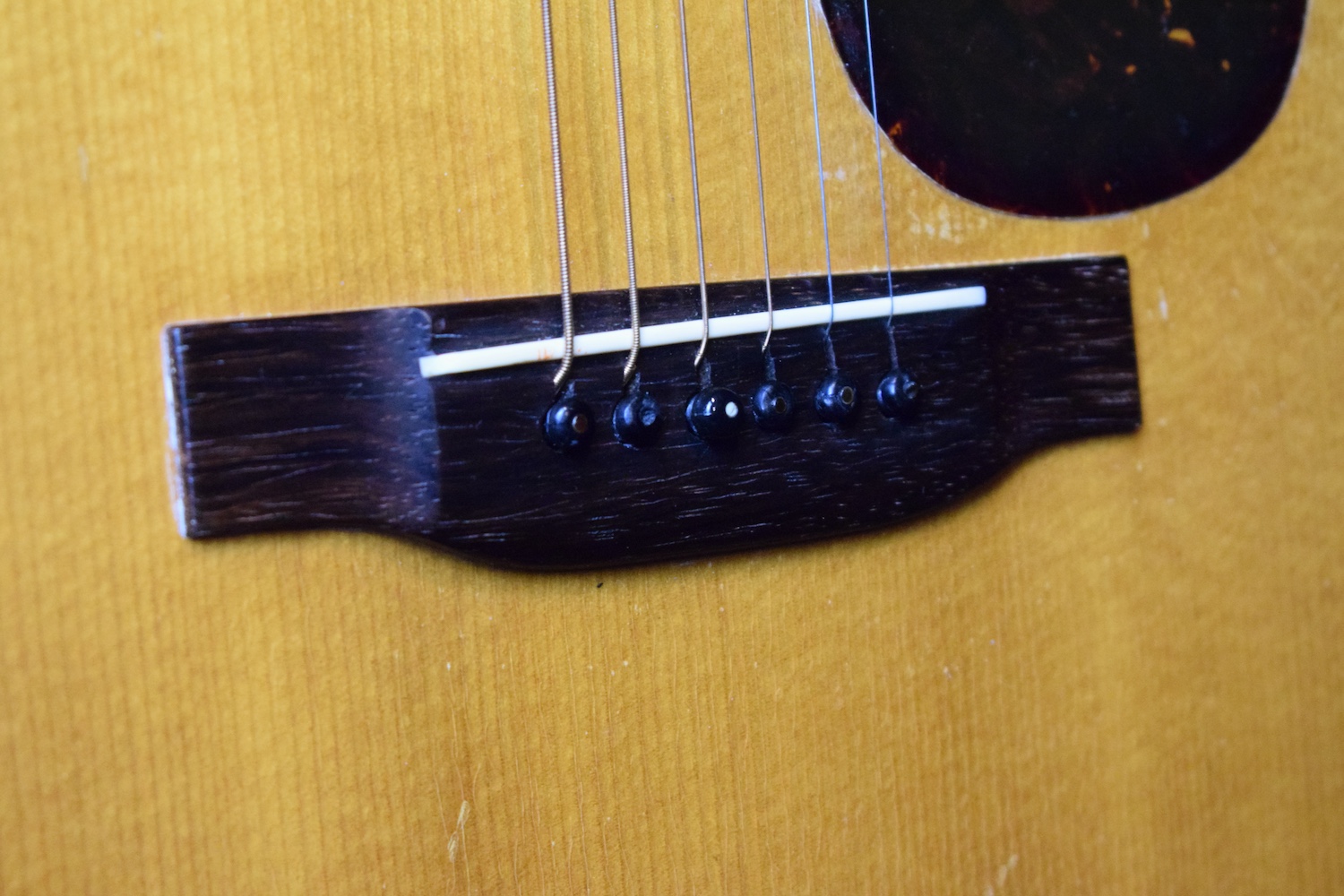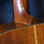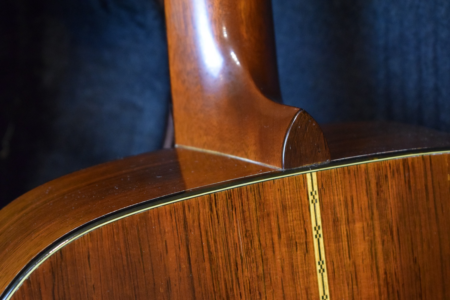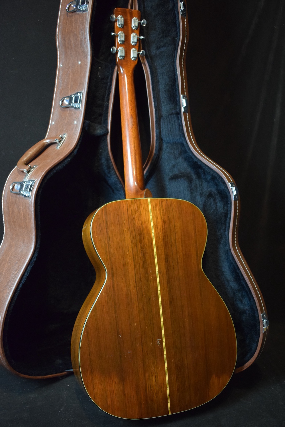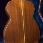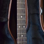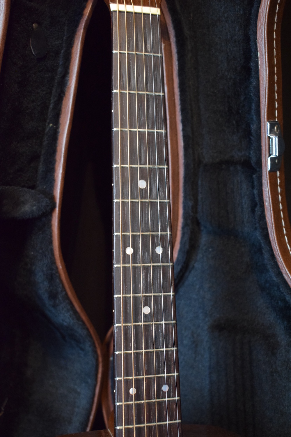 Cette Martin flat top a bel et bien été fabriquée en 1950. Les photos parlent d’elle même. C’est assez incroyable et très rare d’en trouver en si bon état. C’est une guitare sans fentes et parfaitement jouable. On peut se dire parfois qu’une guitare qui n’a pas de marque n’a pas été beaucoup jouée et que par conséquent elle pourrait moins sonner qu’une autre. Je vous assure qu’il n’en est rien et vous vous en rendrez rapidement compte, je pense en moins de 10 secondes, car elle sonne vraiment très très bien, c’est à la fois délié et rond. On retrouve la brillance qui plait tant dans ses guitares avec des aigus précis et d’une grande clarté, mais ce n’est pas trop brillant. Le palissandre apporte bien sûr ce côté un peu explosif avec une grande projection et une rondeur dans les basses qui en fait une guitare vraiment très complète. C’est juste un instrument dont on a pris soin et pour cause il me parait assez exceptionnel d’un point de vue sonore. Maintenant en ce qui concerne la lutherie en elle-même, elle est irréprochable, toutes les barres sont bien collées, le chevalet est original bien sûr ainsi que les mécaniques, il n’y a rien à redire. L’angle du manche est parfait et la guitare bien jouable sur l’ensemble du manche. Elle est fournie avec un étui rigide et un ancien si vous le souhaitez.
