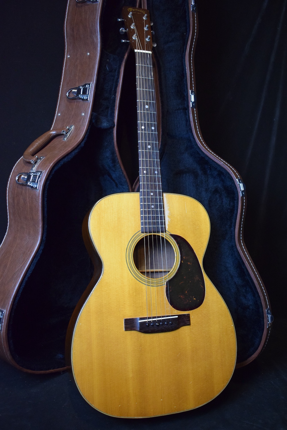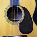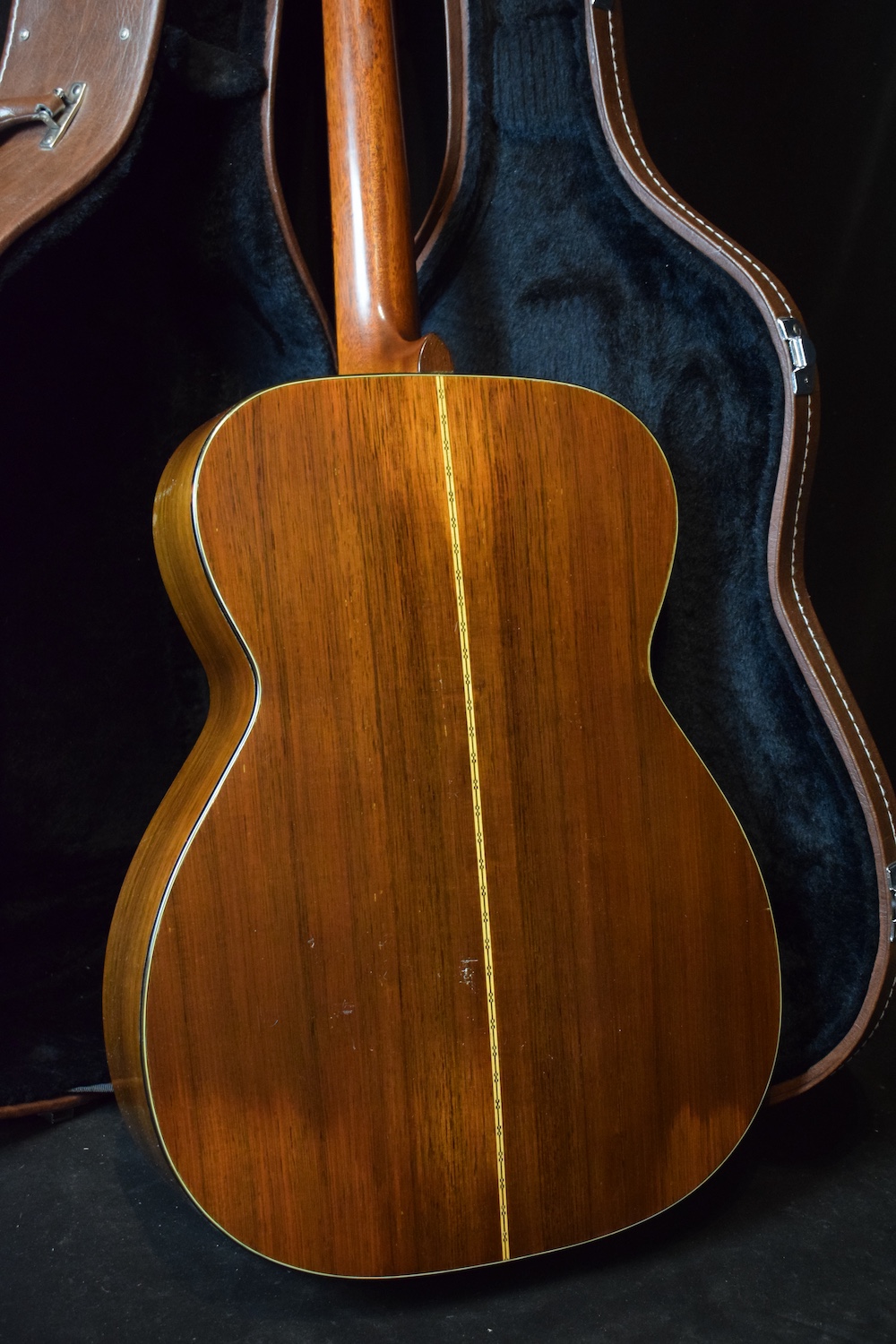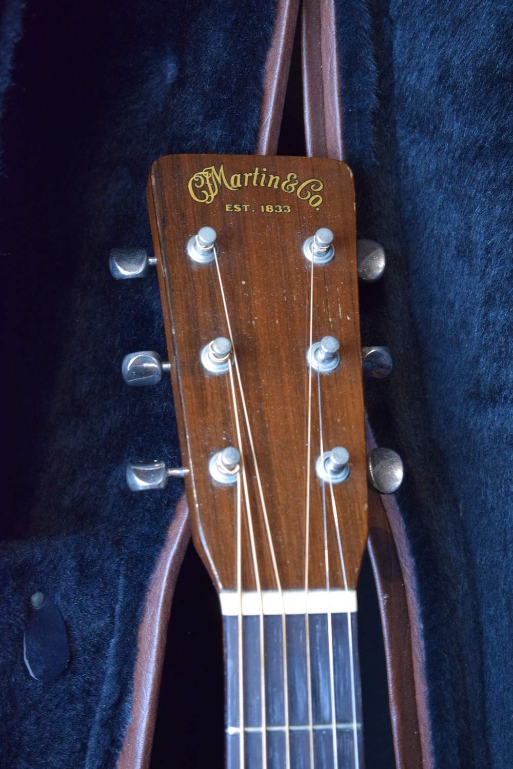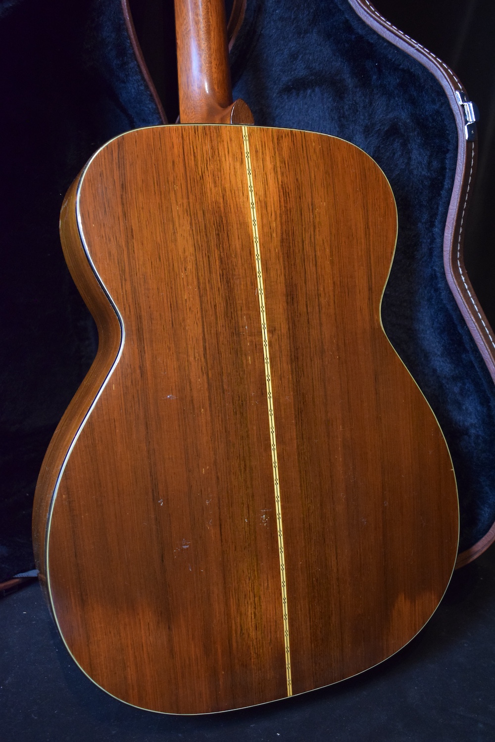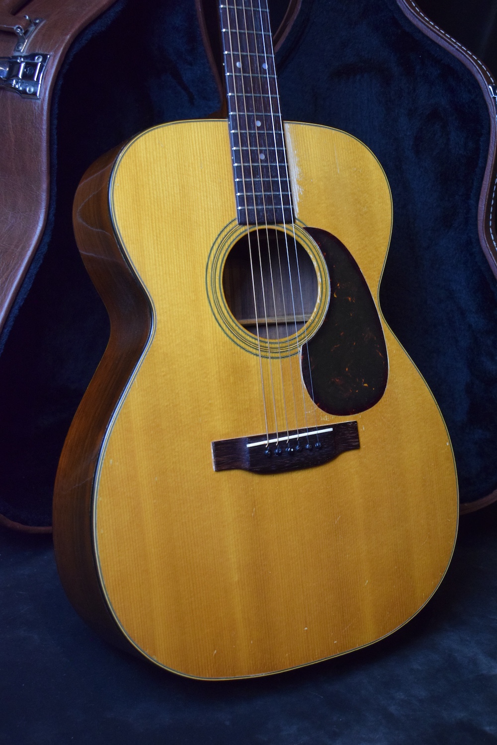 Cette Martin flat top a bel et bien été fabriquée en 1950. Les photos parlent d’elle même. C’est assez incroyable et très rare d’en trouver en si bon état. C’est une guitare sans fentes et parfaitement jouable. On peut se dire parfois qu’une guitare qui n’a pas de marque n’a pas été beaucoup jouée et que par conséquent elle pourrait moins sonner qu’une autre. Je vous assure qu’il n’en est rien et vous vous en rendrez rapidement compte, je pense en moins de 10 secondes, car elle sonne vraiment très très bien, c’est à la fois délié et rond. On retrouve la brillance qui plait tant dans ses guitares avec des aigus précis et d’une grande clarté, mais ce n’est pas trop brillant. Le palissandre apporte bien sûr ce côté un peu explosif avec une grande projection et une rondeur dans les basses qui en fait une guitare vraiment très complète. C’est juste un instrument dont on a pris soin et pour cause il me parait assez exceptionnel d’un point de vue sonore. Maintenant en ce qui concerne la lutherie en elle-même, elle est irréprochable, toutes les barres sont bien collées, le chevalet est original bien sûr ainsi que les mécaniques, il n’y a rien à redire. L’angle du manche est parfait et la guitare bien jouable sur l’ensemble du manche. Elle est fournie avec un étui rigide et un ancien si vous le souhaitez.
