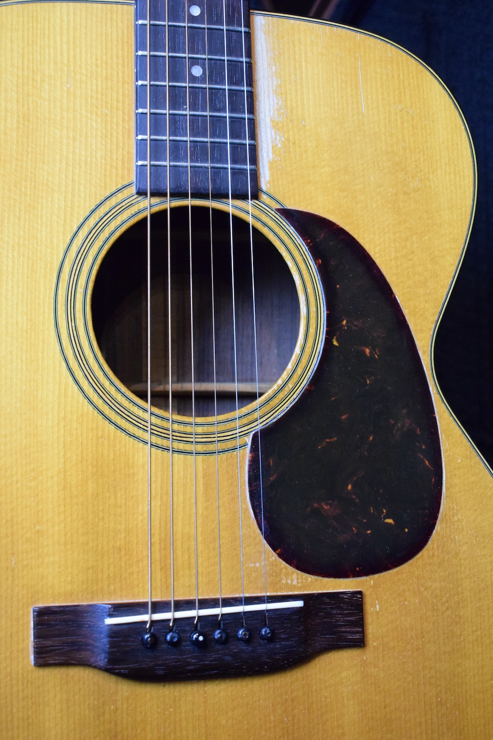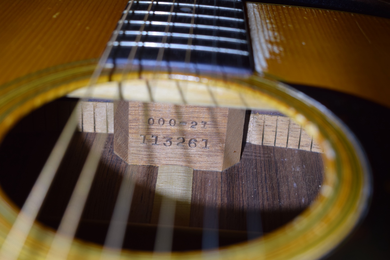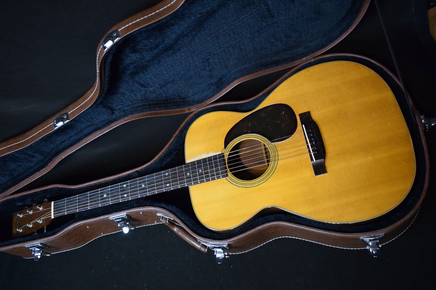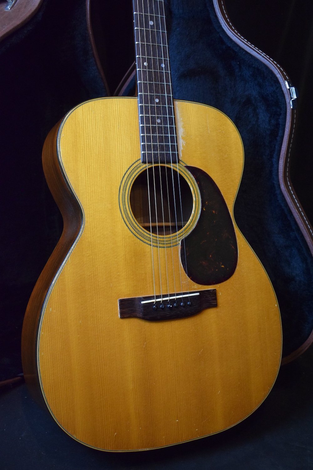 Cette Martin flat top a bel et bien été fabriquée en 1950. Les photos parlent d’elle même. C’est assez incroyable et très rare d’en trouver en si bon état. C’est une guitare sans fentes et parfaitement jouable. On peut se dire parfois qu’une guitare qui n’a pas de marque n’a pas été beaucoup jouée et que par conséquent elle pourrait moins sonner qu’une autre. Je vous assure qu’il n’en est rien et vous vous en rendrez rapidement compte, je pense en moins de 10 secondes, car elle sonne vraiment très très bien, c’est à la fois délié et rond. On retrouve la brillance qui plait tant dans ses guitares avec des aigus précis et d’une grande clarté, mais ce n’est pas trop brillant. Le palissandre apporte bien sûr ce côté un peu explosif avec une grande projection et une rondeur dans les basses qui en fait une guitare vraiment très complète. C’est juste un instrument dont on a pris soin et pour cause il me parait assez exceptionnel d’un point de vue sonore. Maintenant en ce qui concerne la lutherie en elle-même, elle est irréprochable, toutes les barres sont bien collées, le chevalet est original bien sûr ainsi que les mécaniques, il n’y a rien à redire. L’angle du manche est parfait et la guitare bien jouable sur l’ensemble du manche. Elle est fournie avec un étui rigide et un ancien si vous le souhaitez.