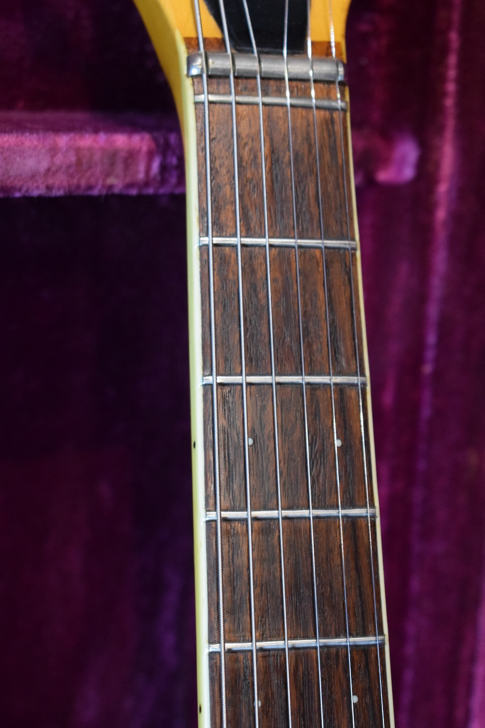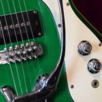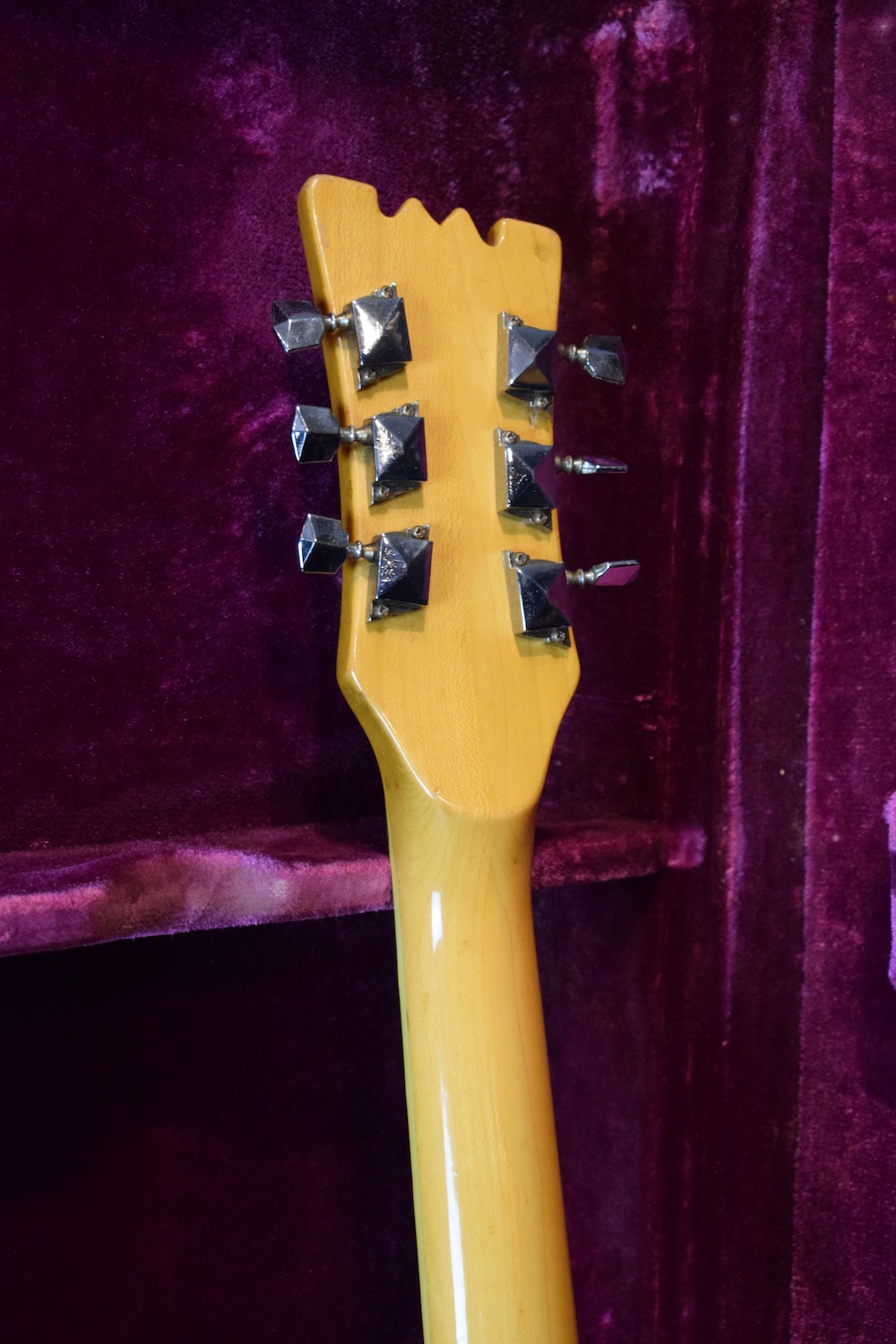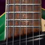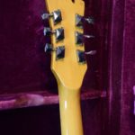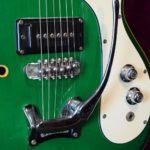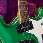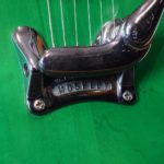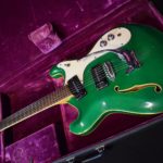 C’est donc un modèle de collection unique d’autant plus qu’il est en parfait état et entièrement original. Le manche est bien droit. Il possède toujours son sillet original en métal. Le vibrato marche bien et les 2 micros délivrent un son puissant et hargneux un peu à la manière d’un P90.