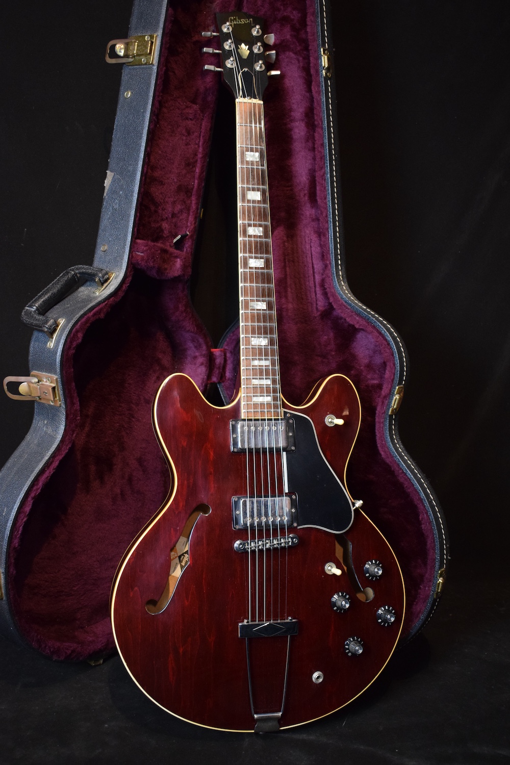 Cette magnifique 12 cordes électriques fut achetée neuve à New York par un jeune photographe travaillant sur le paquebot France lors d’une traversée. Il avait alors dépensé absolument tout son argent (et celui de son cousin..) pour pouvoir se l’offrir. Histoire qui visiblement fait toujours causer dans la famille… Vous constaterez que la guitare fut dédouanée à son retour avec comme adresse France, le paquebot. Cette guitare n’est pas un achat ebay à l’aveuglette. C’est un instrument choisi et chéri. Il a été particulièrement bien traité, n’a subi aucune modification et est en excellent état. On notera que le vernis s’est un peu écaillé sur le dessus de la tête mais c’est tout. Pour le reste l’état est assez impressionnant. Le manche est fin et d’une aisance déconcertante pour une 12 cordes. L’action est basse, ça joue vraiment tout seul. C’est modèle avec le binding en échiquier au dos. L’électronique marche bien. Les micros toasters ont un excellent gain. Rien à redire. Elle est fournie avec son étui rigide original.