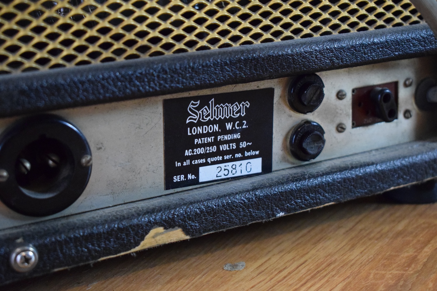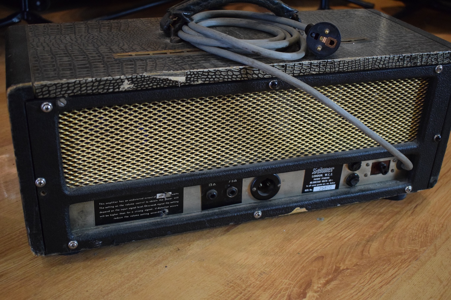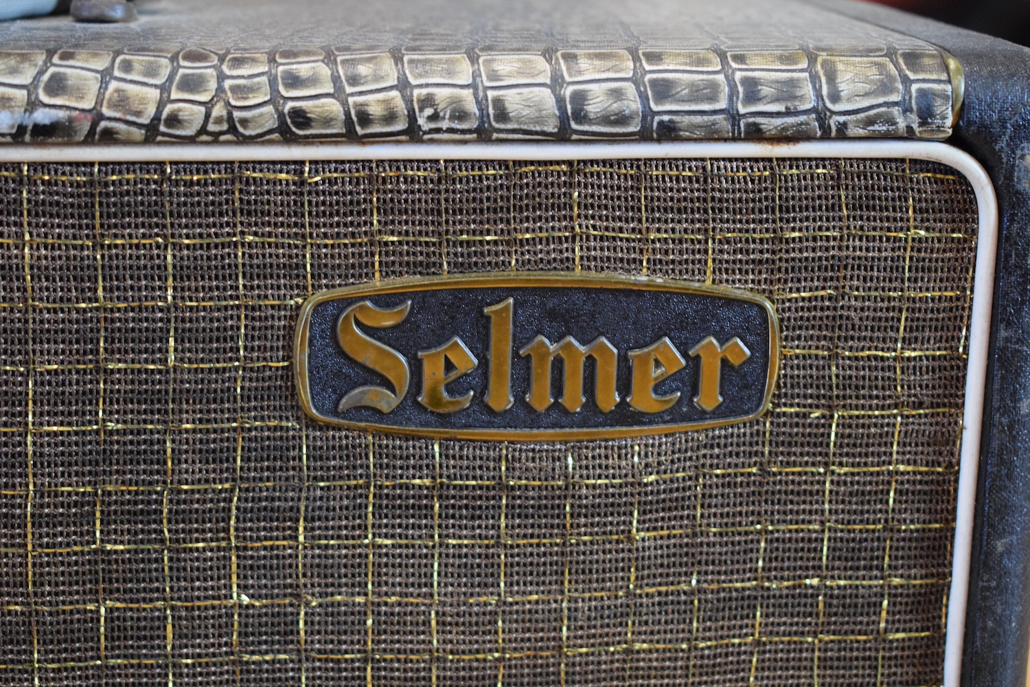 Tête Selmer de la fantastique époque Croc Skin à cheval sur 1963 et 1964. Très franchement ma période préférée pour ma marque préférée d’ampli. On retrouve ici toute la puissance, la chaleur et la rondeur qui en ont fait un marque légendaire. C’est un ampli qui fonctionne parfaitement et en bon état cosmétique.