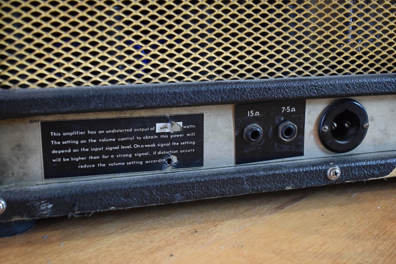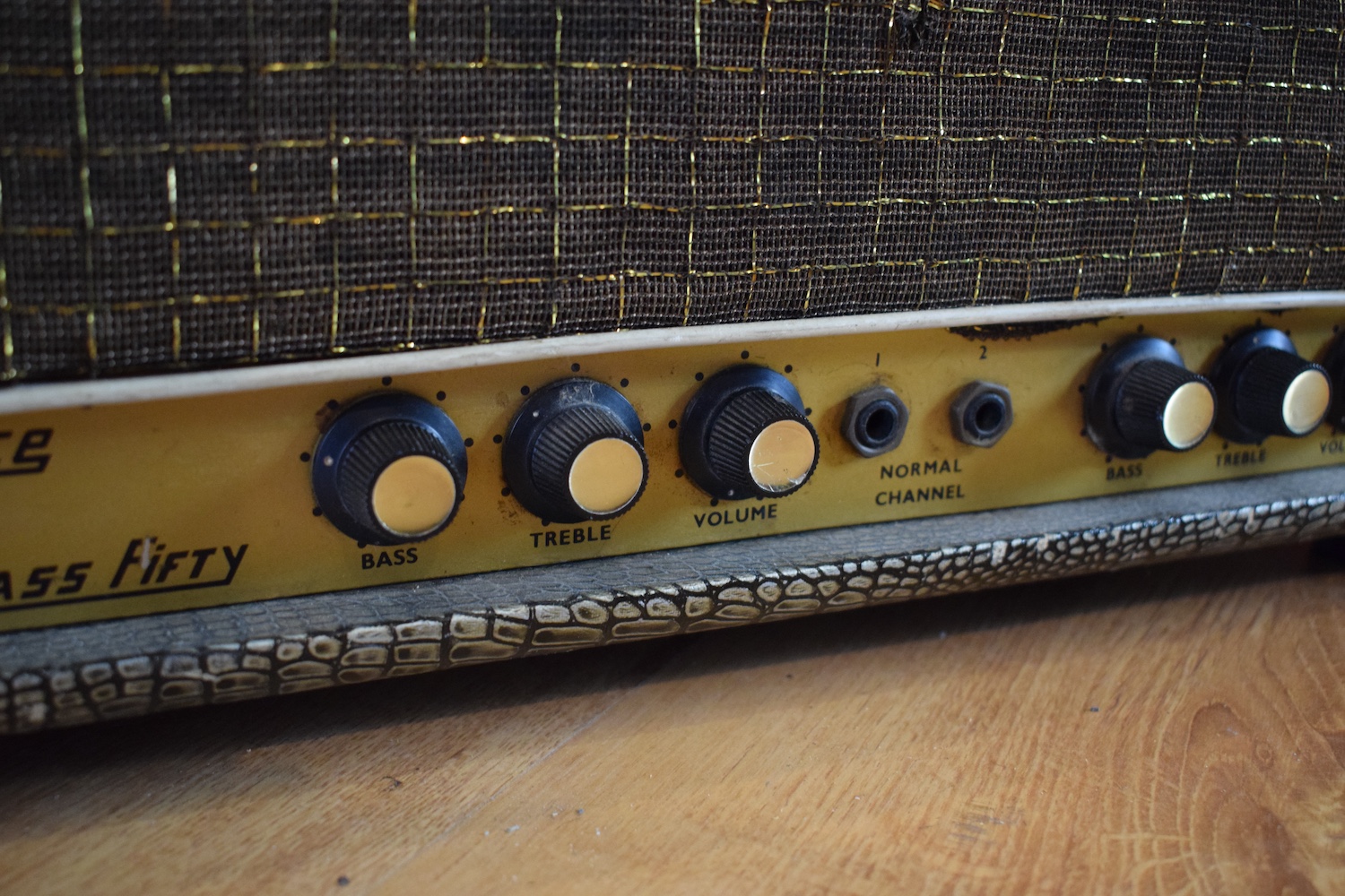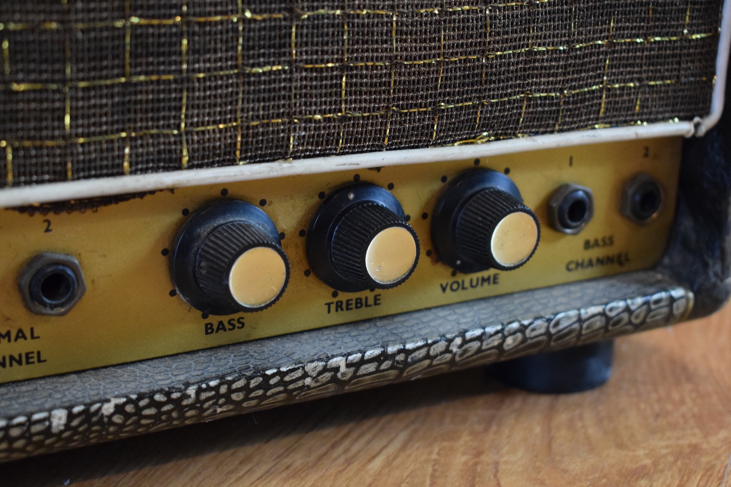 Tête Selmer de la fantastique époque Croc Skin à cheval sur 1963 et 1964. Très franchement ma période préférée pour ma marque préférée d’ampli. On retrouve ici toute la puissance, la chaleur et la rondeur qui en ont fait un marque légendaire. C’est un ampli qui fonctionne parfaitement et en bon état cosmétique.