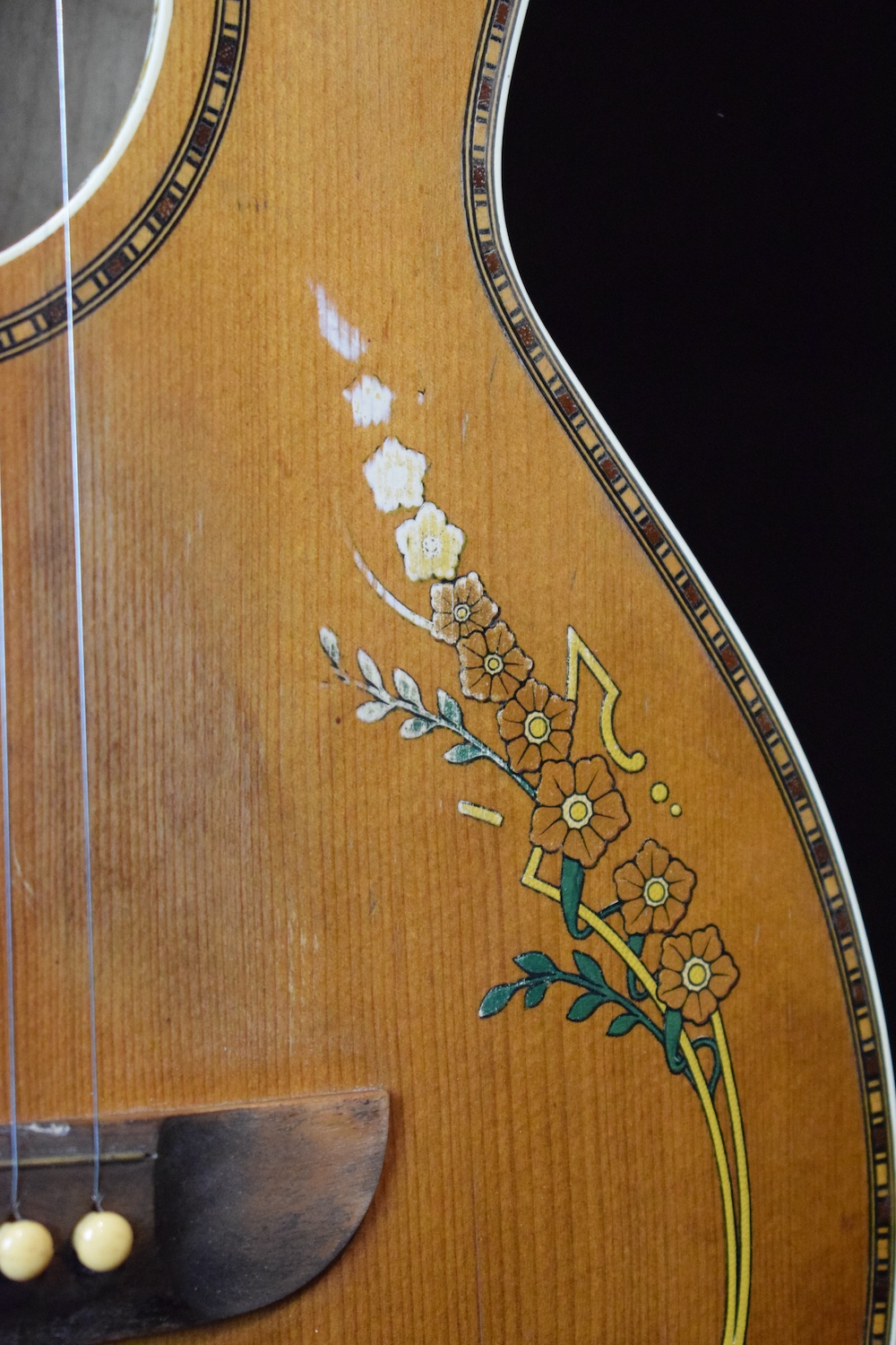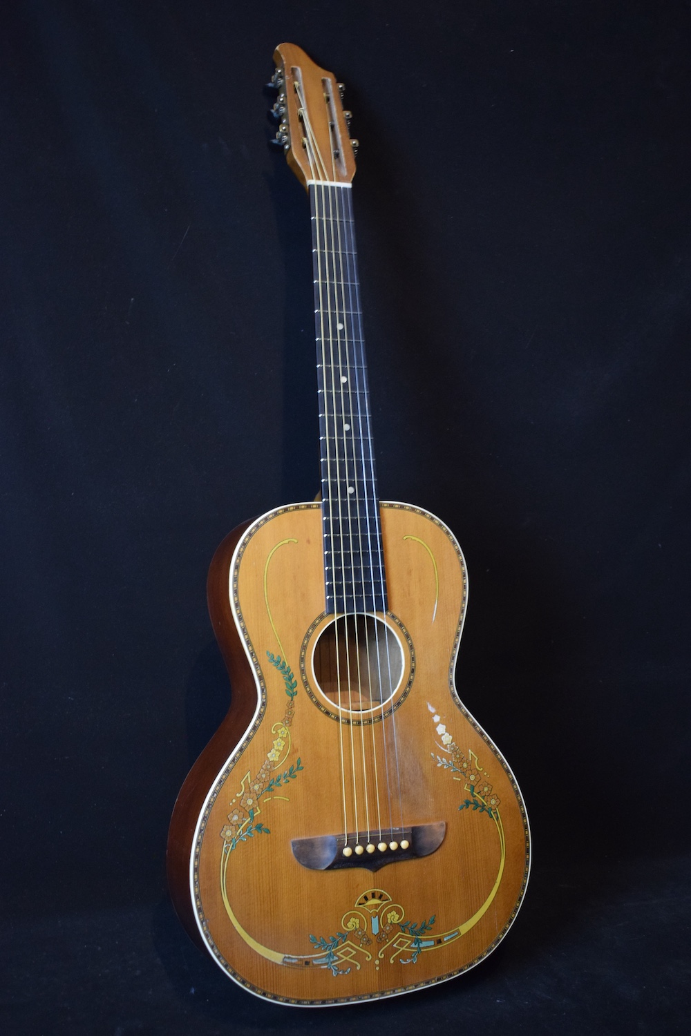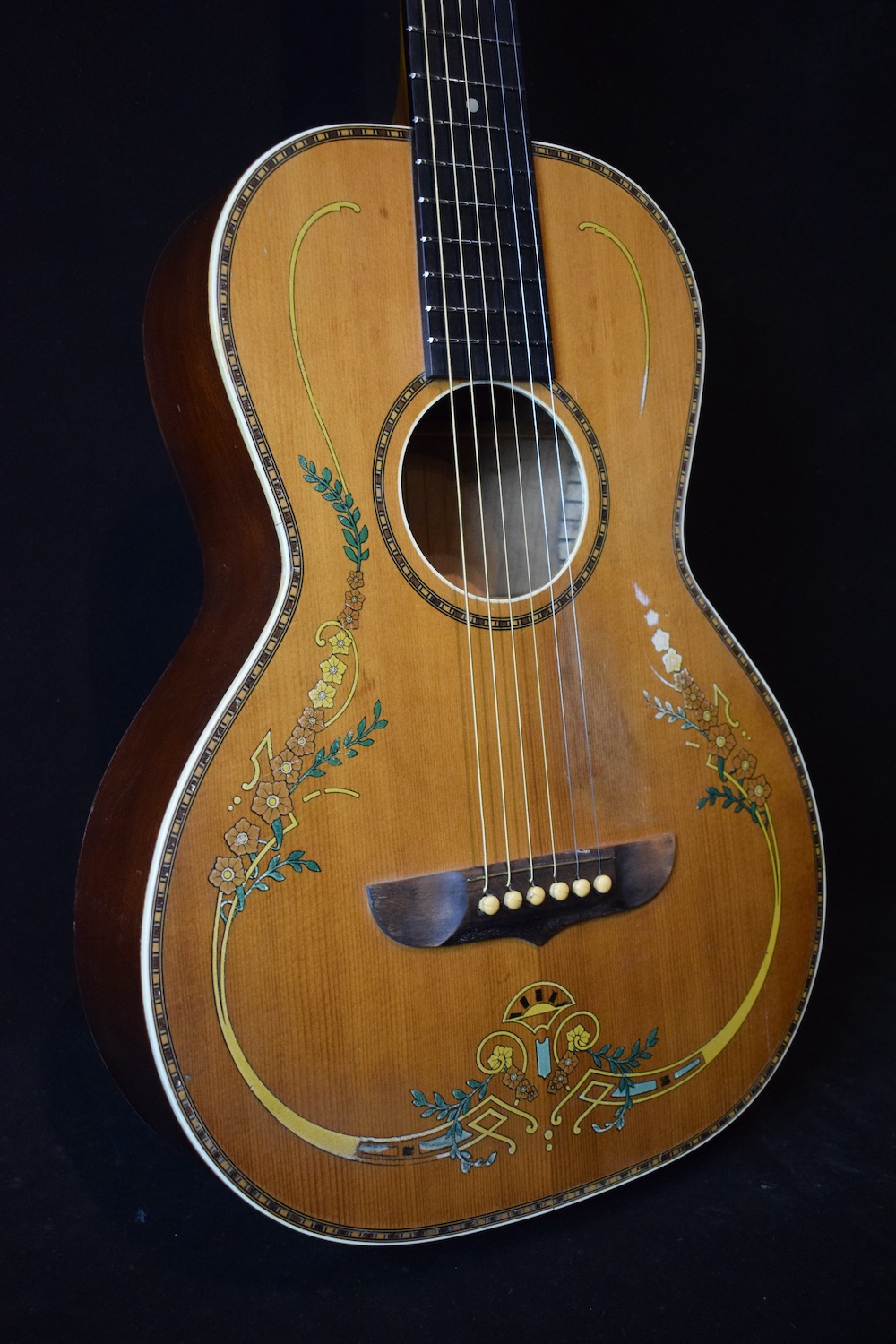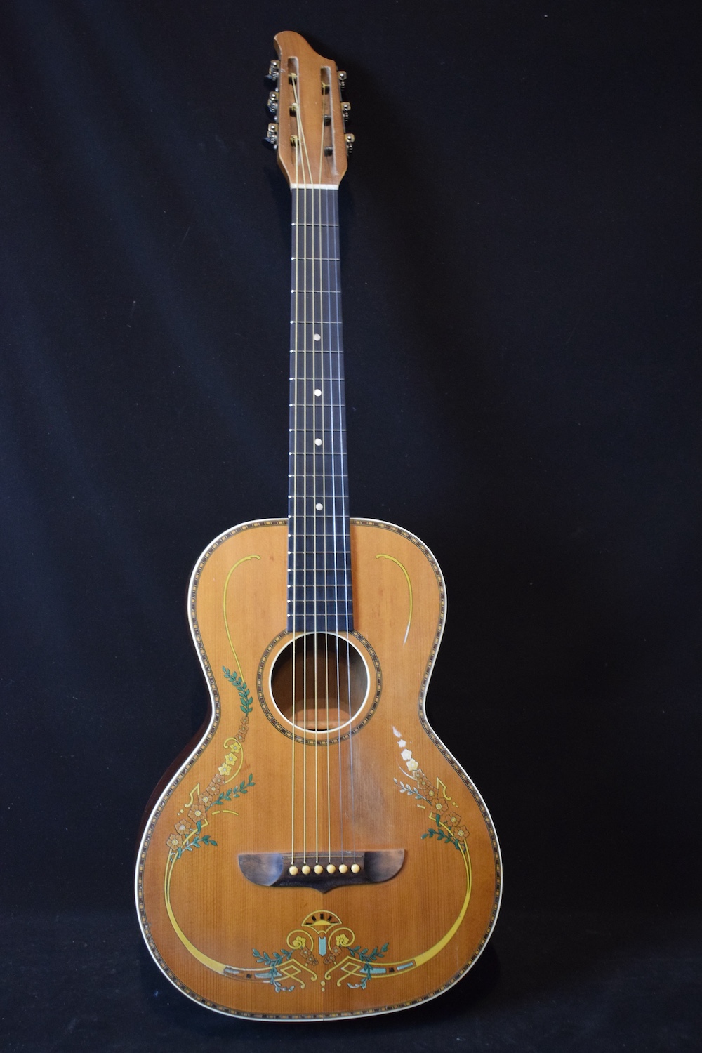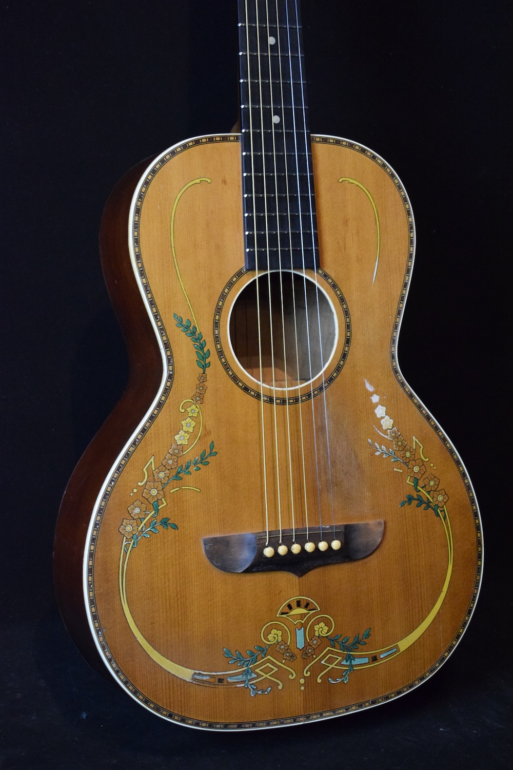 Un instrument restauré qui le méritait largement. Ces modèles sont souvent négligés et dans des états ne permettant pas réellement de les jouer. L’objectif de cette restauration était d’en faire un instrument stable et parfaitement jouable. Elle vient de donc de faire l’objet d’un neck reset et la touche qui est originellement un fruitier teinté a été remplacée, en ébène s’il vous plait. Elle joue très bien avec un timbre typique de ces guitares à barrages parallèles des années 20. Résolument medium et très blues. La projection est intéressante et surtout c’est le timbre, l’âge du bois qui fait la différence. La plupart des dessins Art Deco sont toujours présents. Elle possède ses mécaniques d’origine dans une tête fermée au design original.  Un instrument étonnant, certainement un des rares exemplaires aussi jouable de ce modèle.