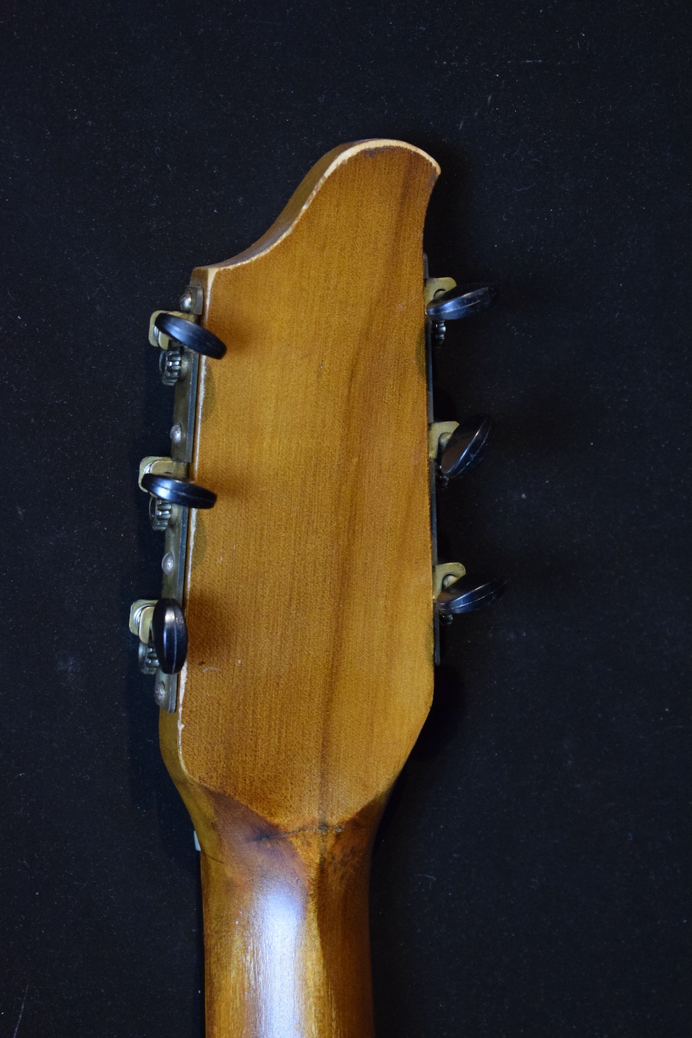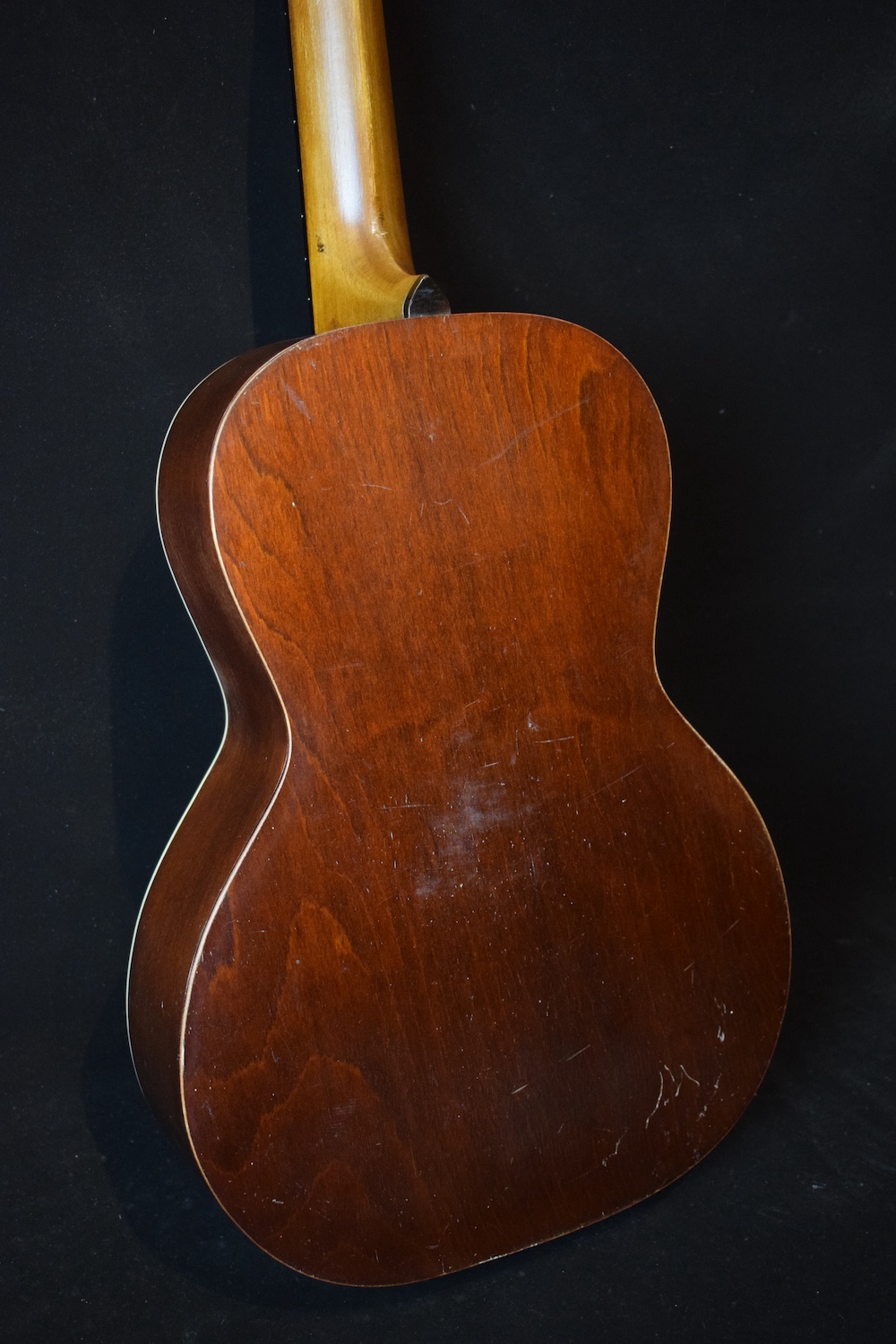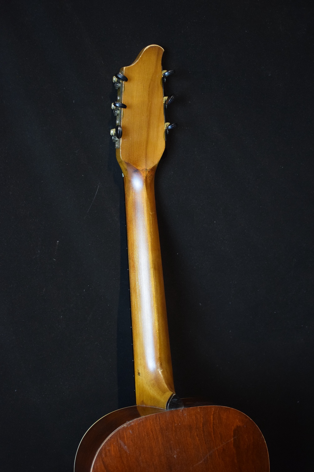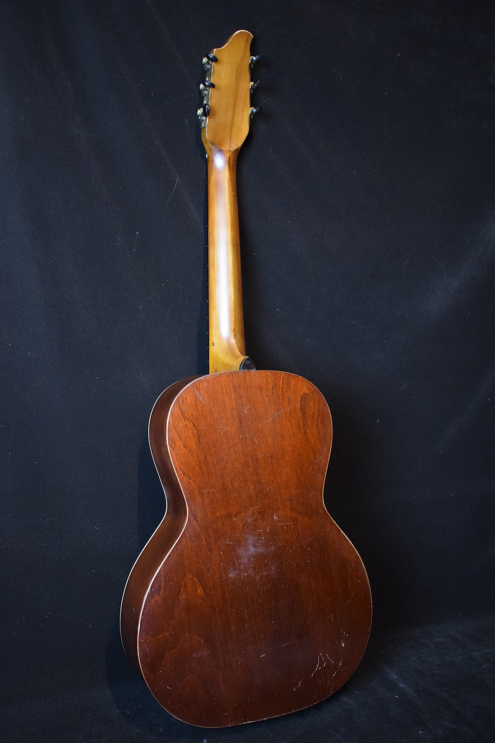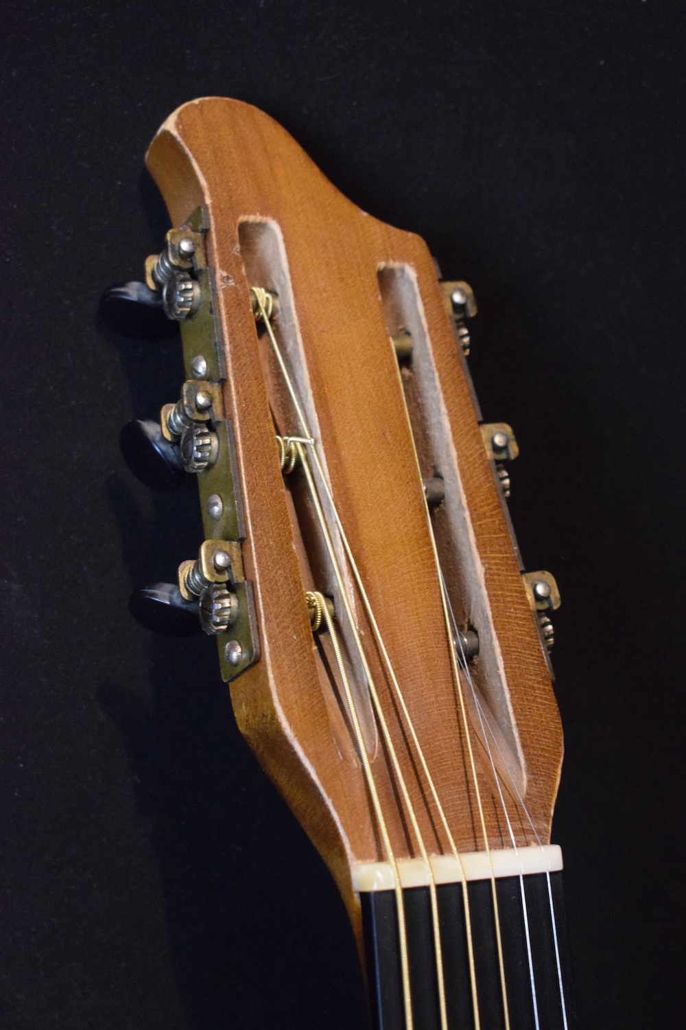 Un instrument restauré qui le méritait largement. Ces modèles sont souvent négligés et dans des états ne permettant pas réellement de les jouer. L’objectif de cette restauration était d’en faire un instrument stable et parfaitement jouable. Elle vient de donc de faire l’objet d’un neck reset et la touche qui est originellement un fruitier teinté a été remplacée, en ébène s’il vous plait. Elle joue très bien avec un timbre typique de ces guitares à barrages parallèles des années 20. Résolument medium et très blues. La projection est intéressante et surtout c’est le timbre, l’âge du bois qui fait la différence. La plupart des dessins Art Deco sont toujours présents. Elle possède ses mécaniques d’origine dans une tête fermée au design original.  Un instrument étonnant, certainement un des rares exemplaires aussi jouable de ce modèle.