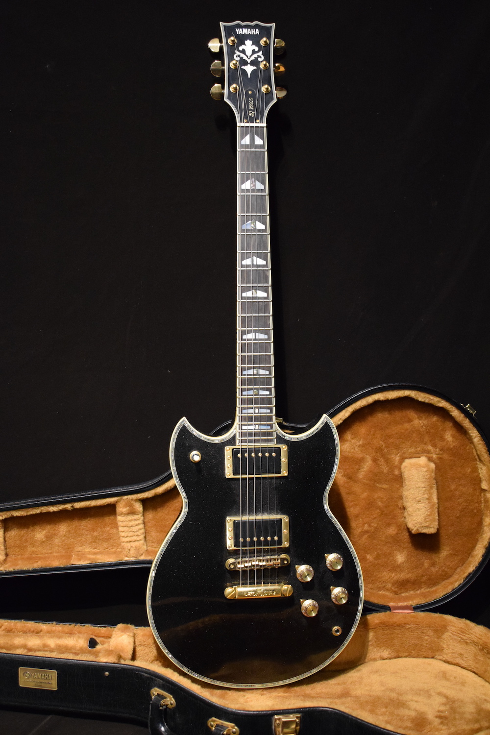 Modèle haut de gamme de la marque. Les Yamaha électriques du début des années 80 sont un secret bien gardé, même si elles sont parfois regardées d’un oeil dédaigneux par les collectionneurs elles n’en sont pas moins d’excellentes guitares. La construction témoigne déjà d’un certain souci de l’excellence. Il ne s’agit pas d’une vulgaire copie de Les Paul au manche vissé, ni même collé, puisque c’est un manche traversant, comme sur une Firebird par exemple. L’accastillage doré est très travaillé, de grande qualité et parfaitement fonctionnel. Très facile à jouer, elle procure à la fois une sensation de souplesse et de robustesse. Les 2 micros sonnent très bien et la guitare possède un vrai sustain. D’ailleurs en parlant de sustain: Santana joua une Yamaha SG2000, un peu moins haut de gamme…Les finitions sont excellentes, ça ne dépasse pas! Jolies Nacres. Peinture noire paillettée. Quasiment aucune marque de jeu. L’état général est remarquable. L’étui rigide original est lui aussi en excellent état.